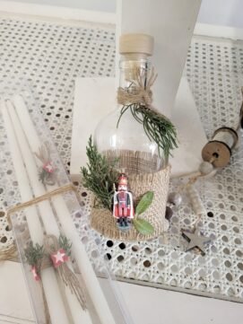 Λαμπάδα με πλούσιο δέσιμο από λινάτσα, λευκή και γαλάζια γάζα και φυσικό σχοινί με μικρά σημαιάκια. Ένα χειροποίητο, υφασμάτινο καραβάκι σε μπλε-λευκό ολοκληρώνει το σύνολο. Αναπόσπαστο κομμάτι του πακέτου βάπτισης με το καράβι.