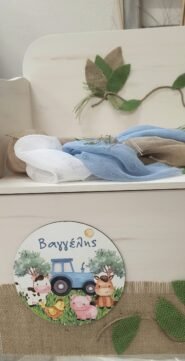 Πακέτο βάπτισης (λαμπάδα/βαλίτσα /λαδοσετ/λαδόπανο) σε αποχρώσεις καφέ, κίτρινου και πράσινου. Τόσο το δέσιμο της λαμπάδας όσο και της βαλίτσας αποτελείται από 3 μεγάλα κομμάτια οργάντζας σε χρώμα καφέ, κίτρινο και κυπαρισσί, τα οποία δένουν όλα μαζί με λινάτσες που πέφτουν σαν κρόσσια, σε χρώμα κίτρινο, πράσινο και της μέντας. Ζωάκια του δάσους από ξύλο ολοκληρώνουν τη σύνθεση μαζί με χρωματιστές ξύλινες χάντρες.