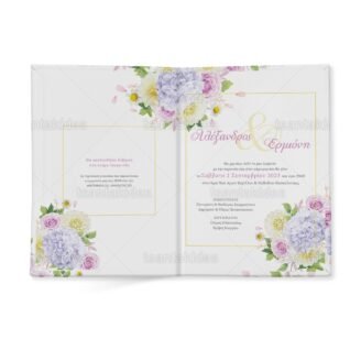 Προσκλητήριο σκληρό καπάκι μεγάλο εκτυπωμένο με floral ρομαντικές συνθέσεις με ορτανσίες και χαμομήλι