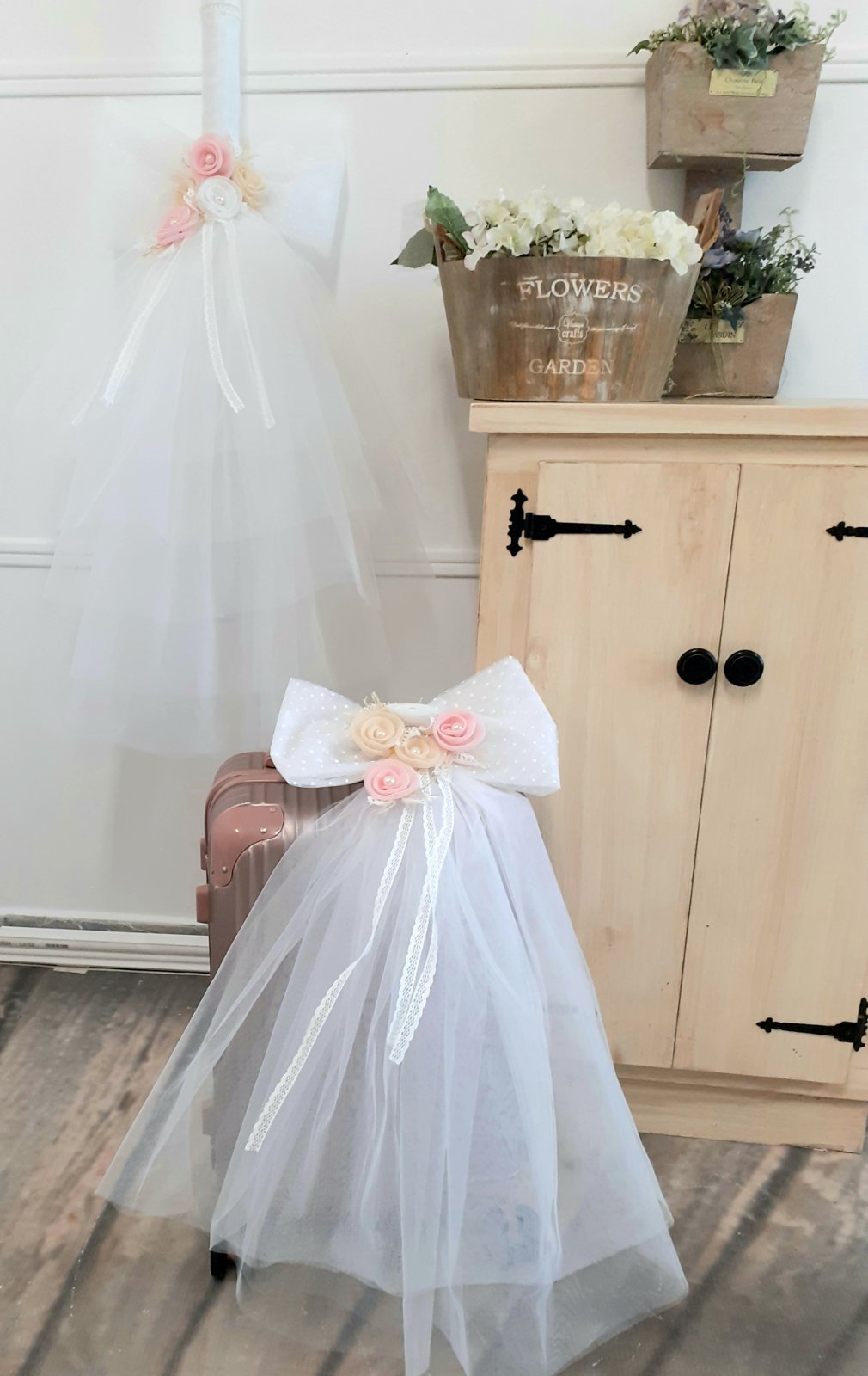 Ονειρεμένο πακέτο βάπτισης (λαμπάδα, βαλίτσα-τρόλεϊ, λαδοσέτ, λαδόπανα) με πλούσιο λευκό τούλι και έναν μεγάλο λευκό πουά φιόγκο που στολίζεται από τούλινα λευκά, ροζ και εκρού λουλούδια. Κυπούρ κορδέλες ολοκληρώνουν το διακριτικό αλλά chic σύνολο.