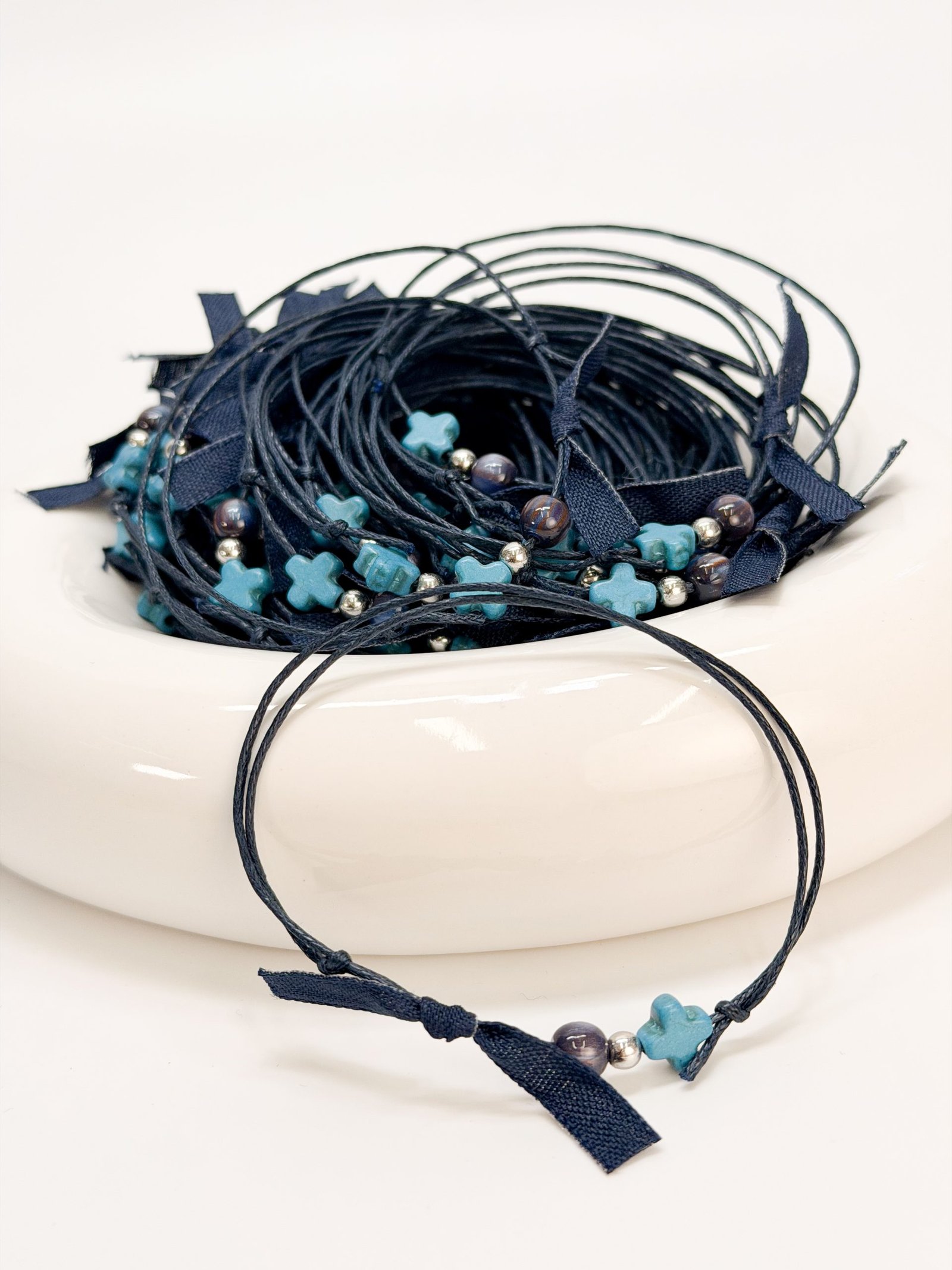 Μαρτυρικό βραχιόλι,με μπλε κορδόνι και φιογκάκι,χαολίτη σταυρό,ασημί χάντρα και μπλε χάντρα.