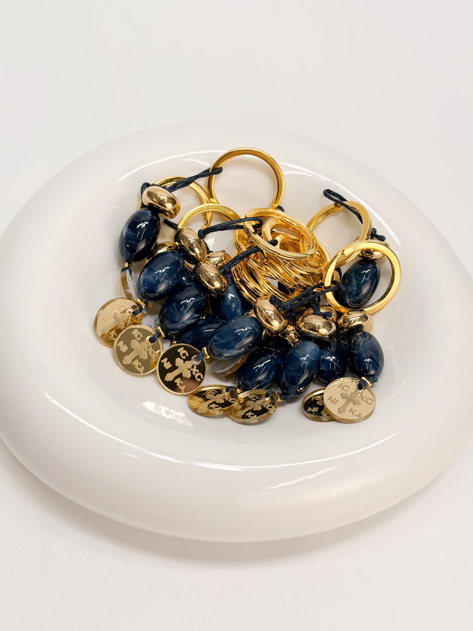 Μαρτυρικό μπρελόκ με χρυσα στοιχεία,μπλε κορδόνι και χάντρα και κωνσταντινάτο plexiglass σταυρό.