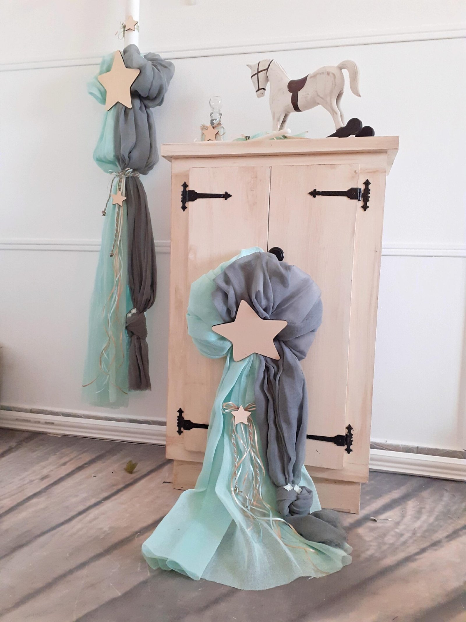 Πακέτο βάπτισης (λαμπάδα, μπράνς, λαδοσετ, λαδόπανο) με θέμα το αστέρι. Πλούσιες γάζες σε αποχρώσεις γκρι και μέντας δένονται μεταξύ τους δίνοντας ένα αέρινο αποτέλεσμα και πάνω σ’ αυτές τοποθετείται ένα μεγάλο, ξύλινο αστέρι. Το σύνολο ολοκληρώνουν μικρά, ξύλινα αστεράκια που κρέμονται από τη σύνθεση με βαμβακερούς σπάγκους και χάντρες στα αντίστοιχα χρώματα.