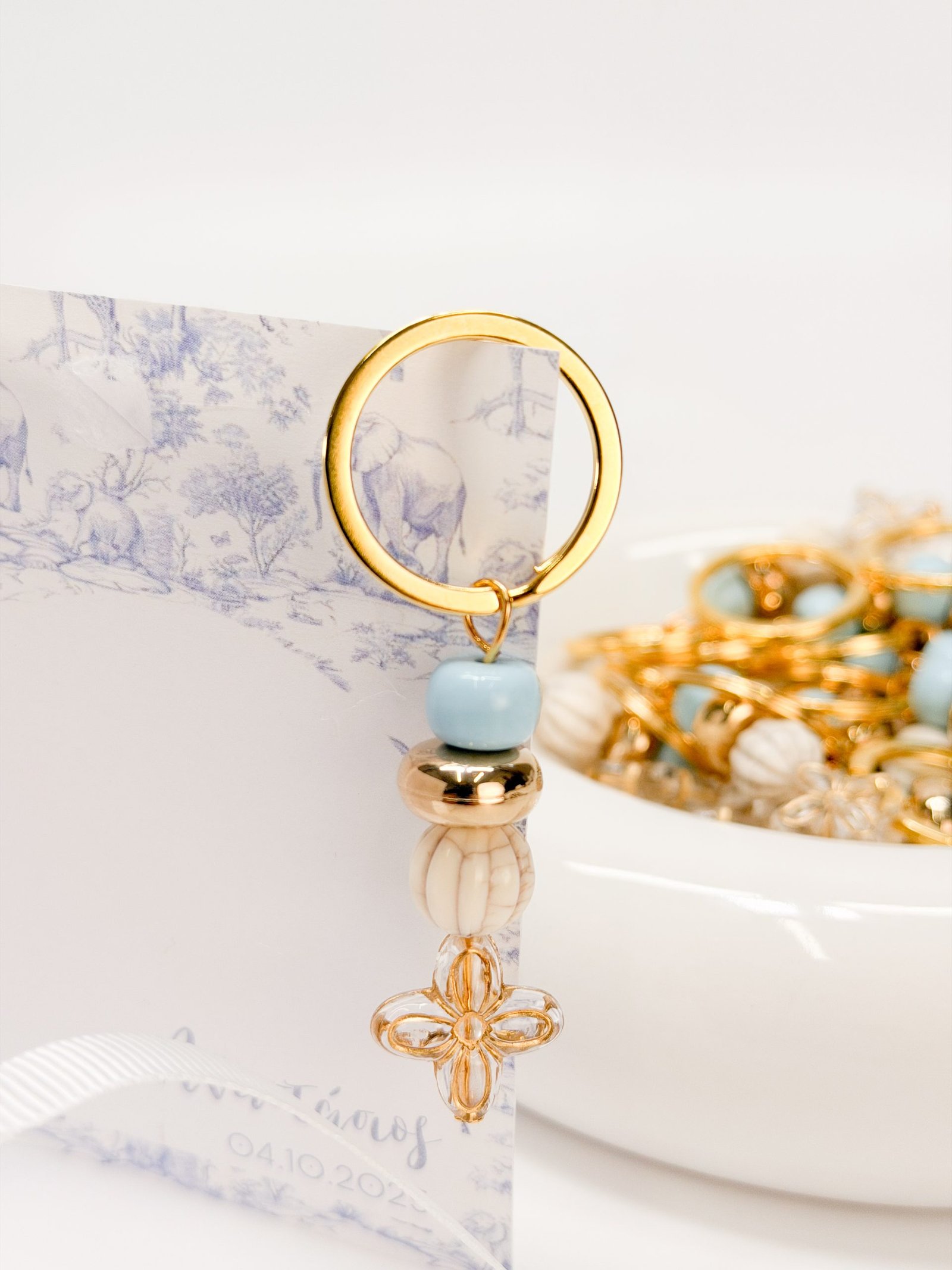 Μαρτυρικό μπρελόκ με γαλάζια ακρυλική χάντρα,χρυσή μεγάλη ροδέλα, δίχρωμη λευκή στρογγυλή χάντρα και ακρυλικό σταυρό σε σχήμα λουλουδιού.