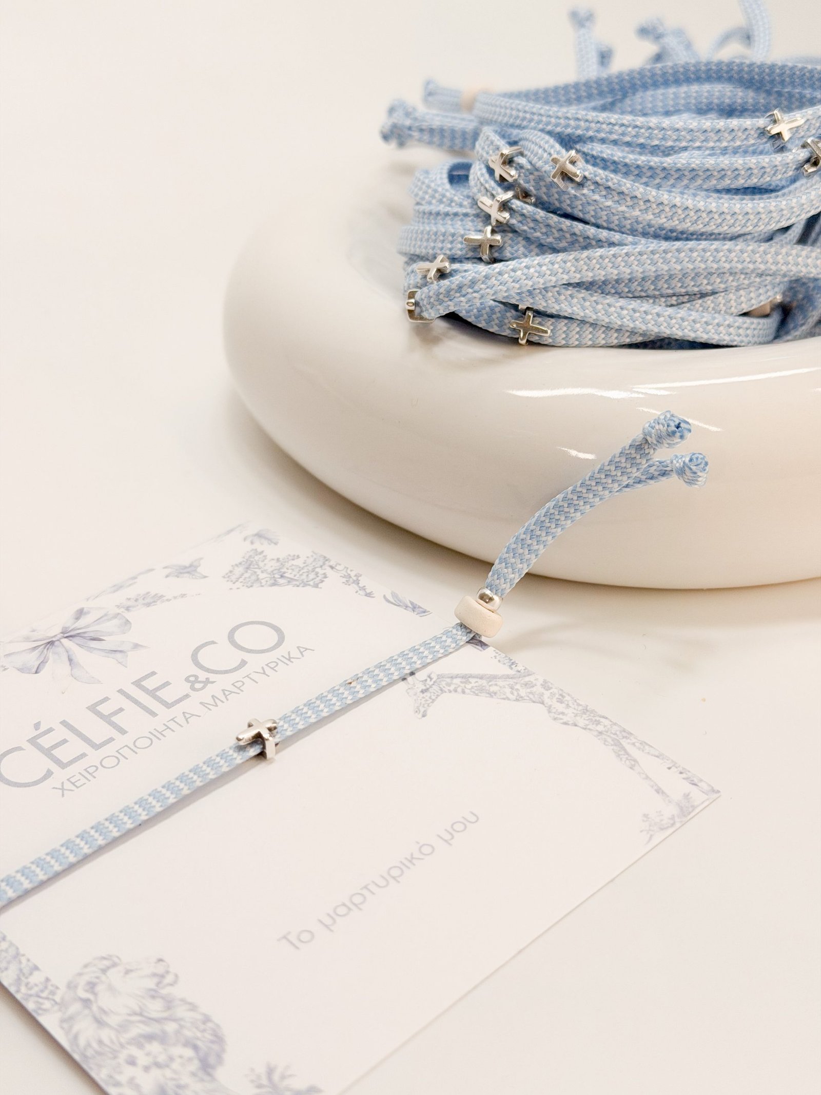 Μαρτυρικό βραχιόλι με δίχρωμο γαλάζιο,άσπρο κορδόνι παπουτσιού,λευκή κεραμική ροδέλα,σταυρό και χάντρα σε ασημί απόχρωση.