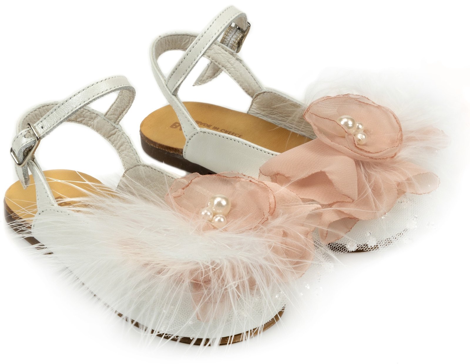 Δερμάτινο Σαμπό Διακοσμημένο με Χειροποίητο Chiffon Λουλούδι και Πούπουλα από Δέρμα Πέρλα σε Εκρού Ροζ Χρώμα