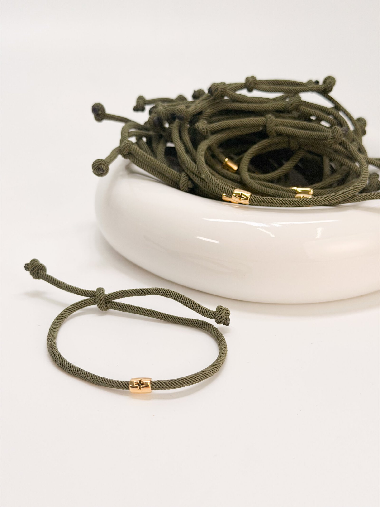Μαρτυρικό βραχιόλι με χακί κορδόνι και επιχρυσωμένο σταυρό.