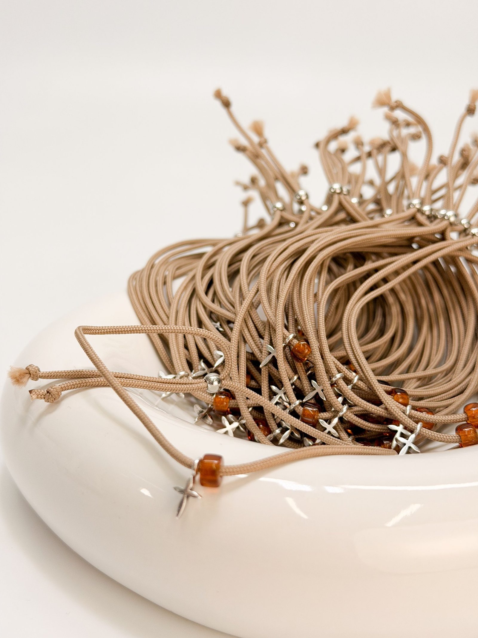 Μαρτυρικό βραχιόλι με μπεζ κορδόνι,καφέ χάντρα και σταυρό σε ασημί απόχρωση.