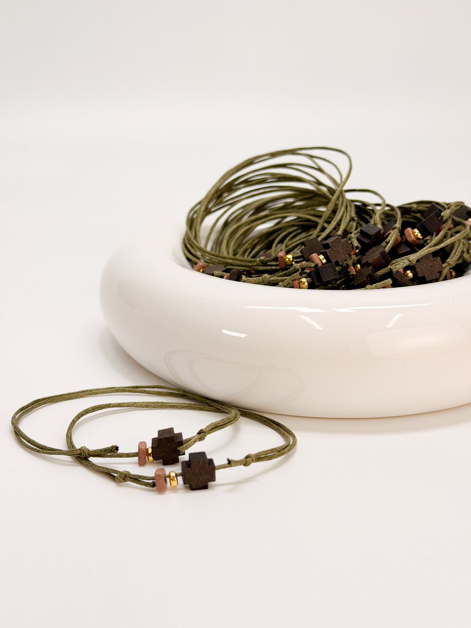 Μαρτυρικό βραχιόλι με λαδί κορδόνι,καφέ ξύλινο σταυρό και κεραμική ροδέλα.