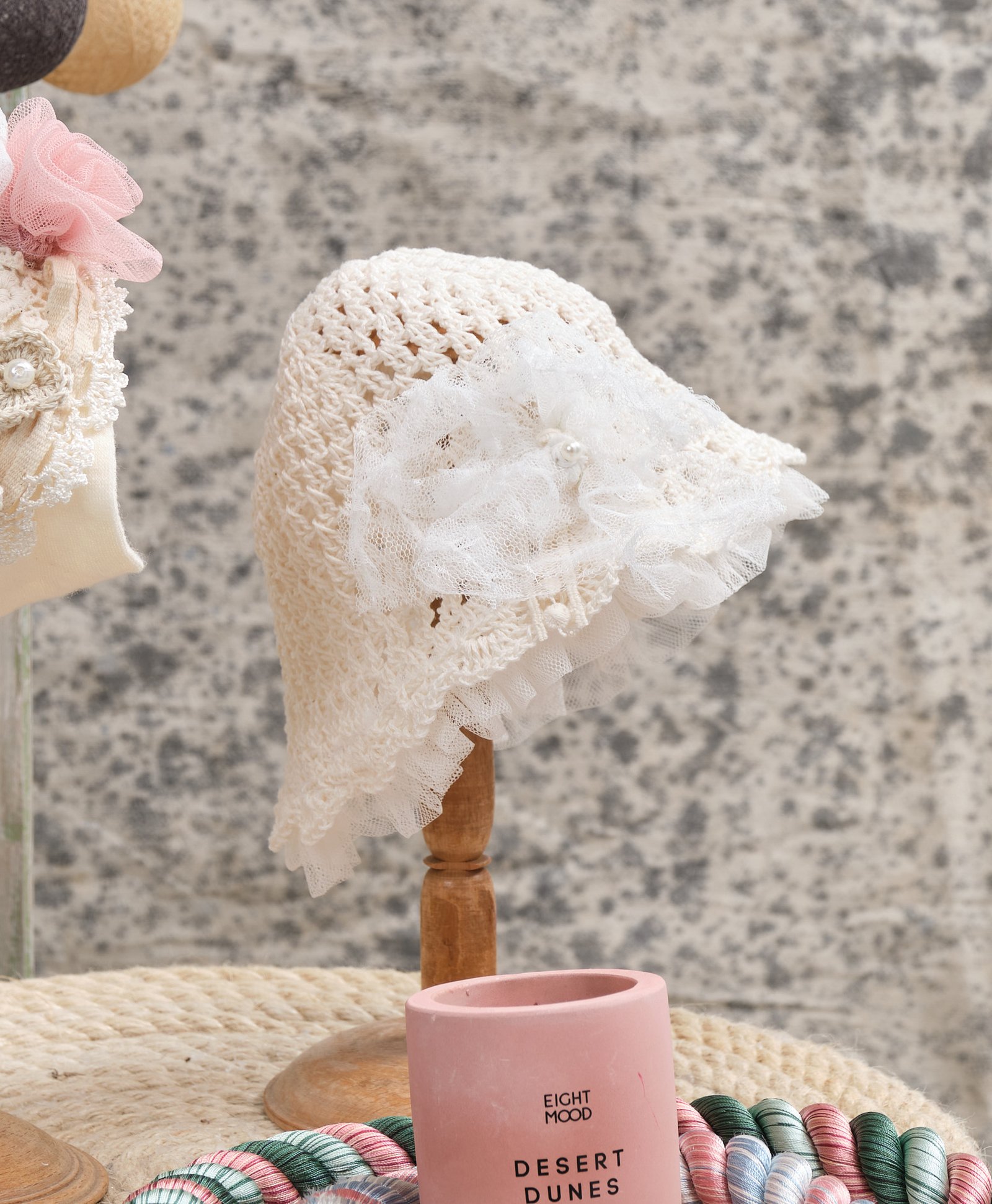 Εκρού πλεκτό σκουφάκι με διακριτικό τελείωμα από λευκό τούλι. Μια μικρή πινελιά- ένα λευκό τούλινο λουλούδι- το διακοσμεί, κάνοντας το ιδανικό συνδυασμό για κάθε τύπο φορέματος σε οποιοδήποτε χρώμα.