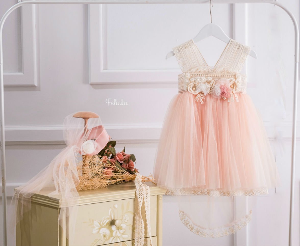 Φόρεμα βάπτισης σε σομόν απόχρωση. Μπούστο από κυπούρ και φαρδιές τιράντες σε ιβουάρ απόχρωση καταλήγει σε τούλινη φούστα. Το μπούστο διακοσμείται από κυπούρ λεπτομέρειες και χειροποίητα λουλουδάκια. Η πλάτη στολίζεται απο ενα εντυπωσιακό λουλούδι καταλήγει σε μια όμορφη, μακριά ουρά με κυπούρ τελείωμα.