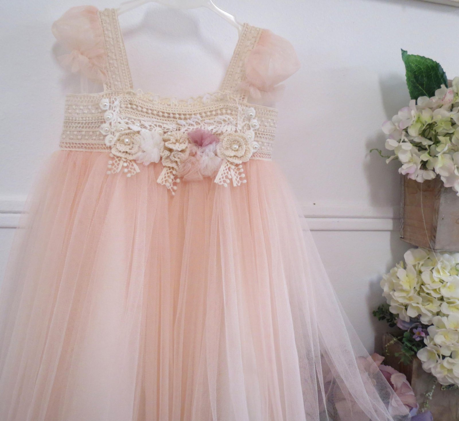 Φόρεμα βάπτισης με κοντό μανίκι, σε σομόν απόχρωση και ασορτί μπαντάνα.Ένα εντυπωσιακό μπούστο από εκρού κυπούρ με όμορφα μανίκια από τιράντα κυπούρ και τούλινο σομόν φρου φρου καταλήγει σε μια γεμάτη τούλινη σομόν φούστα. Στολίζεται από λευκό κυπούρ και λεπτεπίλεπτα πλεκτά, εκρού τριαντάφυλλα και τούλινα λουλουδάκια σε αποχρώσεις του λευκού, του σομόν και του σάπιου μήλου.