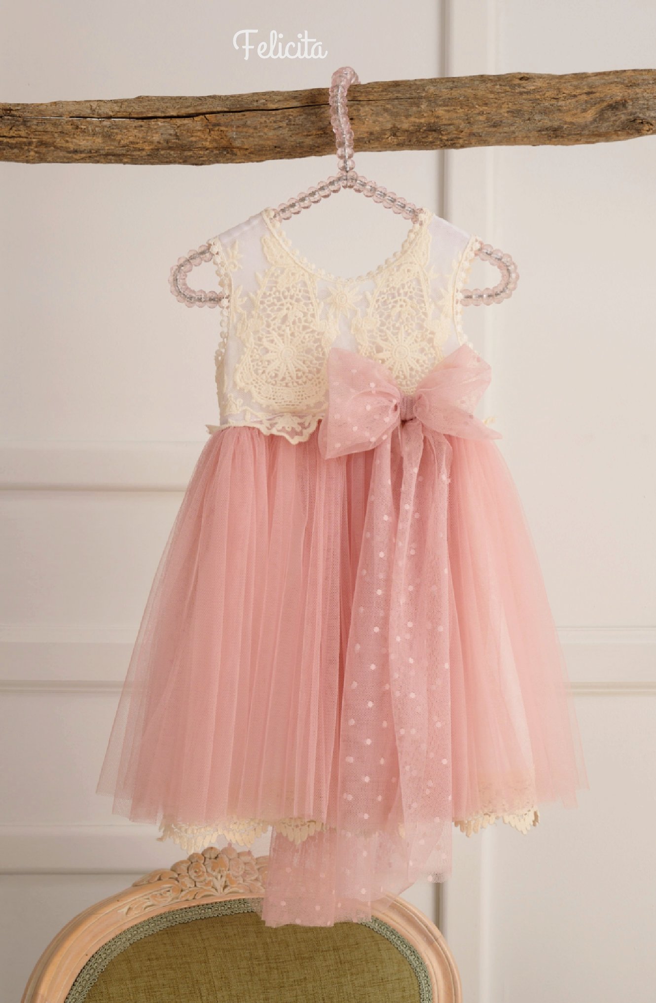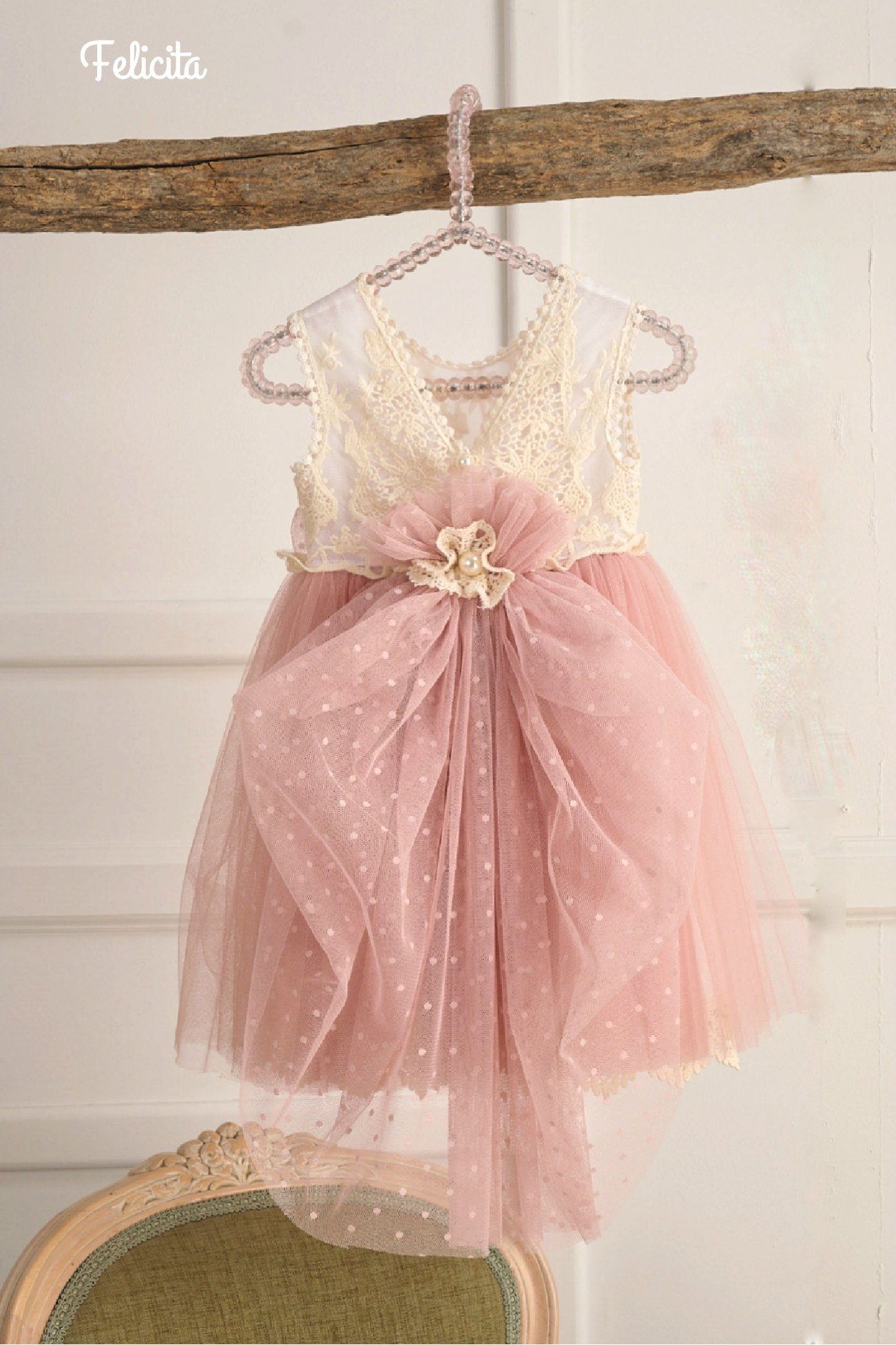 Φόρεμα με εντυπωσιακό τελείωμα στο πίσω μέρος του φορέματος. Κομψό μπούστο από ιβουάρ κυπούρ καταλήγει σε μια πλούσια τούλινη φούστα σε απόχρωση σάπιου μήλου, η οποία γίνεται ακόμα πιο κομψή χάρη στο δαντελένιο τελείωμα της εσωτερικής φόδρας της. Ένας όμορφος πουά, τούλινος φιόγκος στολίζει το τελείωμα του μπούστου ενώ στην πλάτη καταλήγει σε ανοιχτό V και στολίζεται από ένα πλούσιο τούλινο λουλούδι με πλέκτη λεπτομέρεια στο κέντρο και πέρλα. Από εκεί μια τούλινη πουά, εντυπωσιακή ουρά πιάνεται πάνω στη φούστα και πέφτει με διακριτικές σουρίτσες.