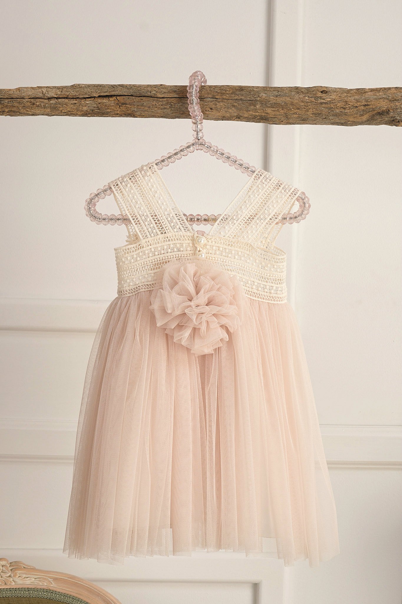 Φόρεμα σε nude απόχρωση για ένα αρμονικό νεραϊδένιο αποτέλεσμα με μπαντάνα. Ένα φορεματάκι που αποτελείται από φαρδιές τιράντες και μπούστο από εκρού κυπούρ και μια πλούσια τούλινη φούστα σε απόχρωση αμύγδαλου. Το μπούστο μπροστά στολίζεται από ένα μπουκετάκι τούλινων λουλουδιών σε αποχρώσεις βεραμάν,nude και σάπιου μήλου στο πίσω μέρος δένει με κουμπιά πέρλες και ένα μεγάλο, φουντωτό, τούλινο λουλούδι. Συνδυάζεται με τούλινο, αέρινο σκουφάκι με κυπούρ λεπτομέρειες και στολισμένο με παρόμοιο μπουκετάκι λουλουδιών.