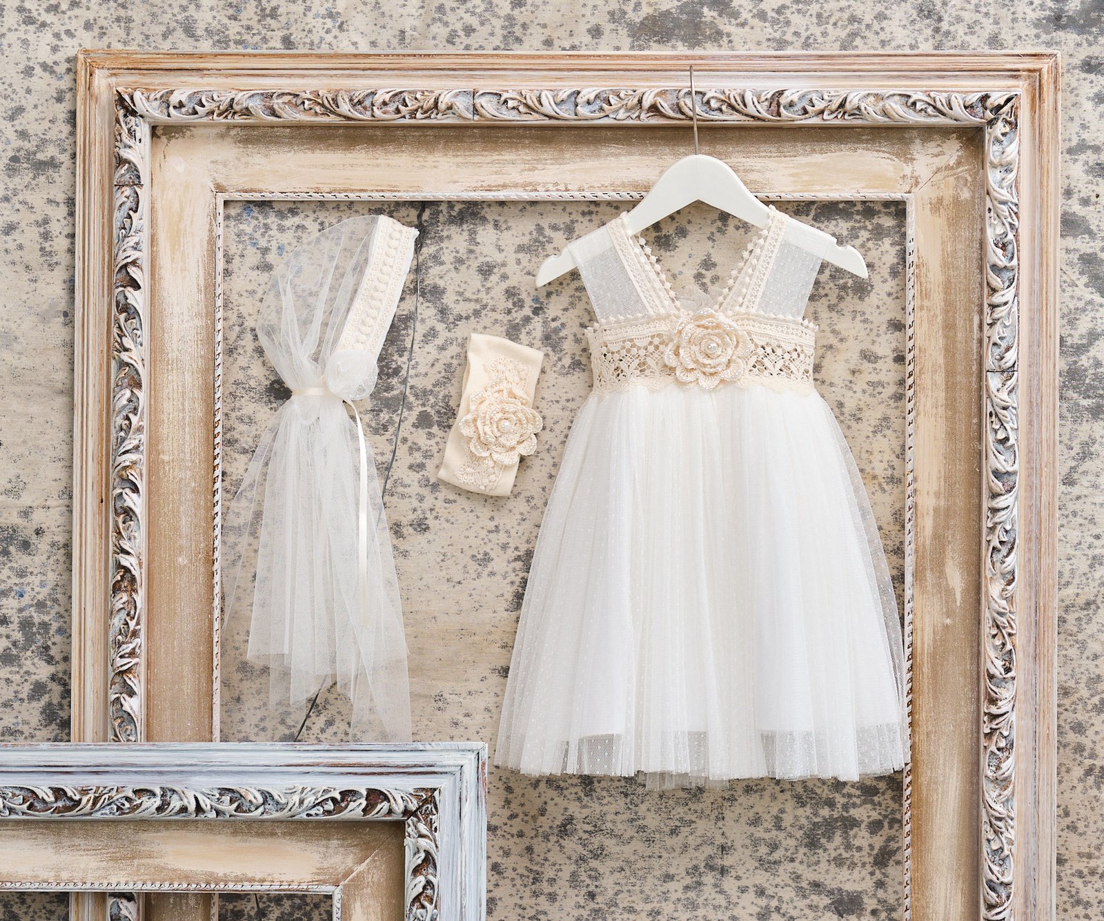 Ιβουάρ αέρινο φορεματάκι. Τα διάφανα πουά φαρδιά ραντάκια του με τελείωμα κυπούρ τρέσας δημιουργούν και στις δυο πλευρές V που καταλήγει σε ένα μεγάλο λουλούδι- στην μπροστινή όψη σε ένα μεγάλο πλεκτό εκρού τριαντάφυλλο και στην πίσω σε ένα μεγάλο τούλινο λουλούδι.