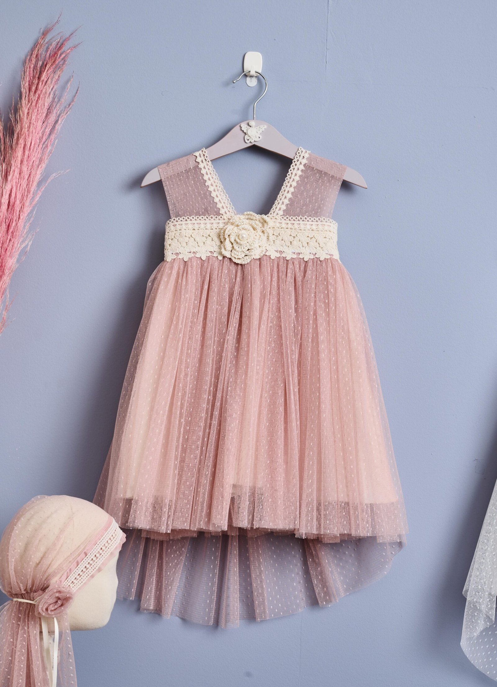 Ρομαντικό πουά φόρεμα σε απόχρωση σάπιου μήλου . Με φαρδιές διάφανες ράντες από τούλι που σχηματίζουν στο στήθος και στην πλάτη ένα μεγάλο V και μια φάσα από δαντέλα εκρού, το φόρεμα ολοκληρώνεται με μακριά σαπιο μήλο πουά φούστα που μαζεύεται ψηλά στην πλάτη δημιουργώντας μια ξεχωριστή ουρά.