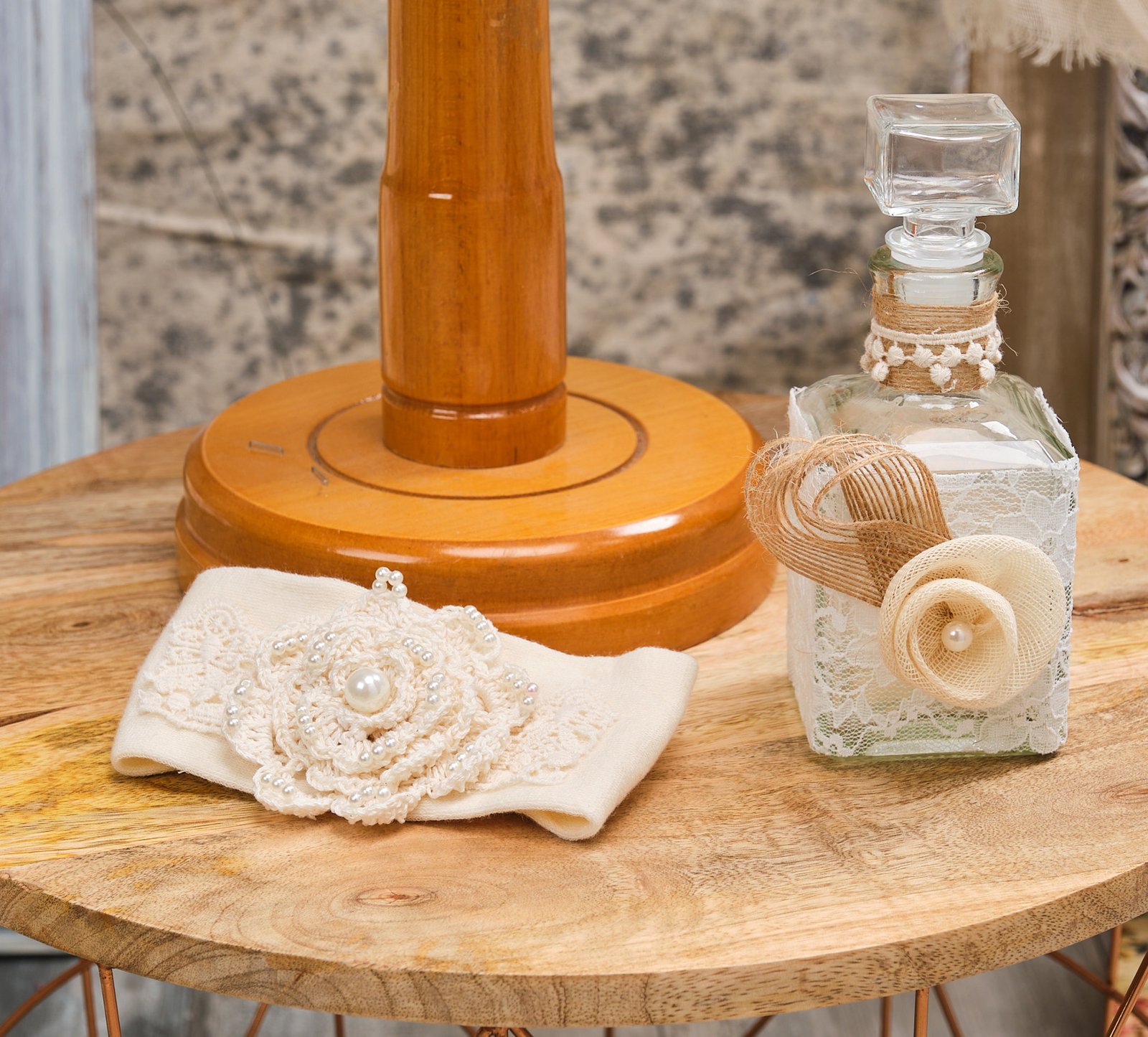 Κορδέλα εκρού από ελαστικό ύφασμα διακοσμημένη από κυπούρ εκρού τρέσα και ένα μεγάλο πλεκτό τριαντάφυλλο που το στολίζουν μικρές πέρλες. Αποτελεί ιδανική εναλλακτική επιλογή για το φόρεμα με τη λευκή τούλινη φούστα και εναρμονίζεται τέλεια με το σύνολο του πακέτου βάπτισης με τη λευκή και εκρού γάζα.
