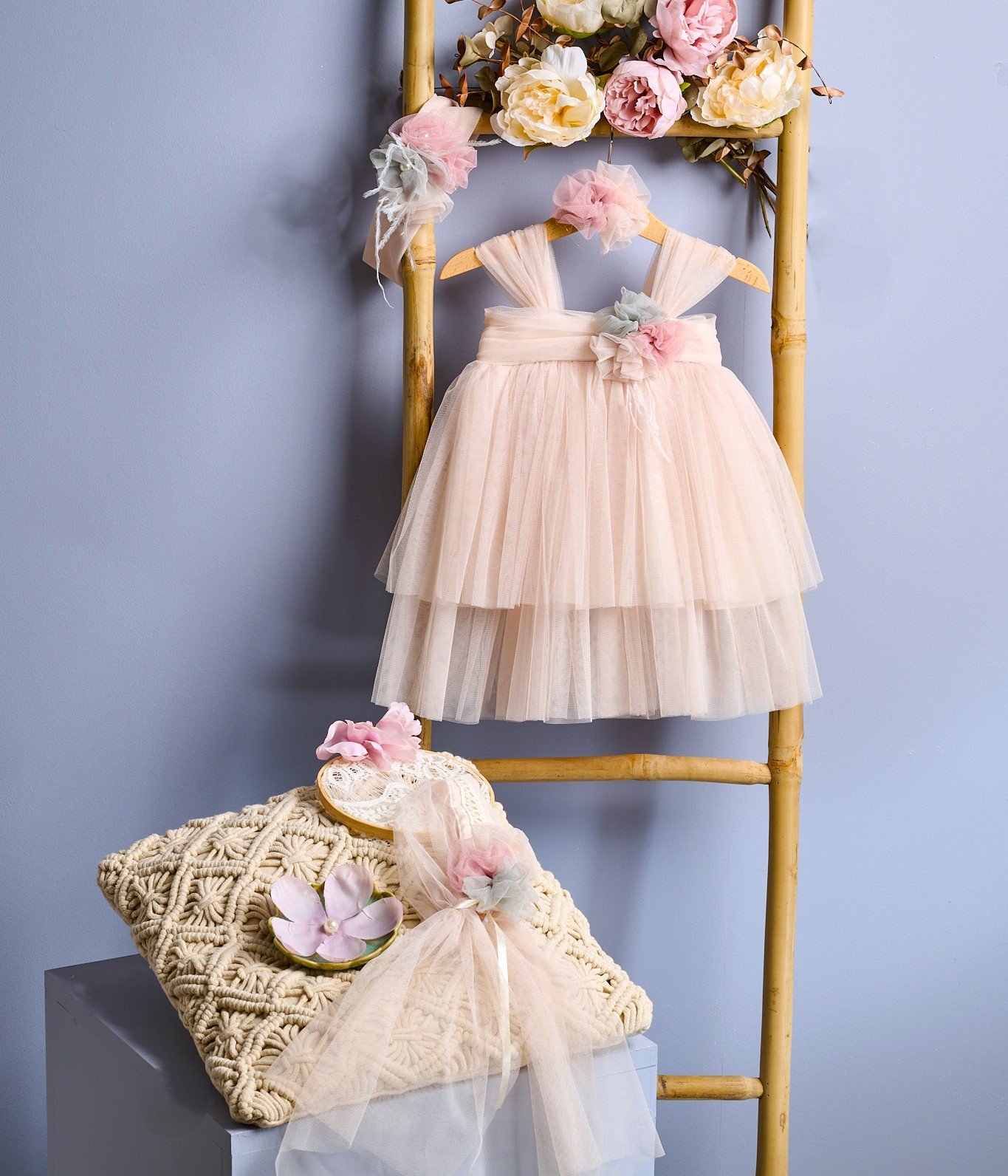 Ρομαντικό φόρεμα αμάνικο με 2 στρώσεις απο τούλι της ίδιας απόχρωσης ,διακοσμημένο με χειροποίητα λουλούδια και πέρλες σε σαπιο μήλο, πράσινο και nude .