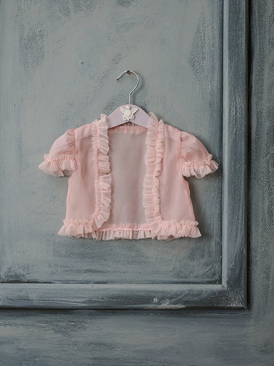 Ρομαντικό σάπιο μήλο μπολερό. Τόσο στα μανίκια όσο και στα τελειώματα του, μικρές σούρες από το ίδιο τούλι δίνουν μια πιο παιχνιδιάρικη αίσθηση.