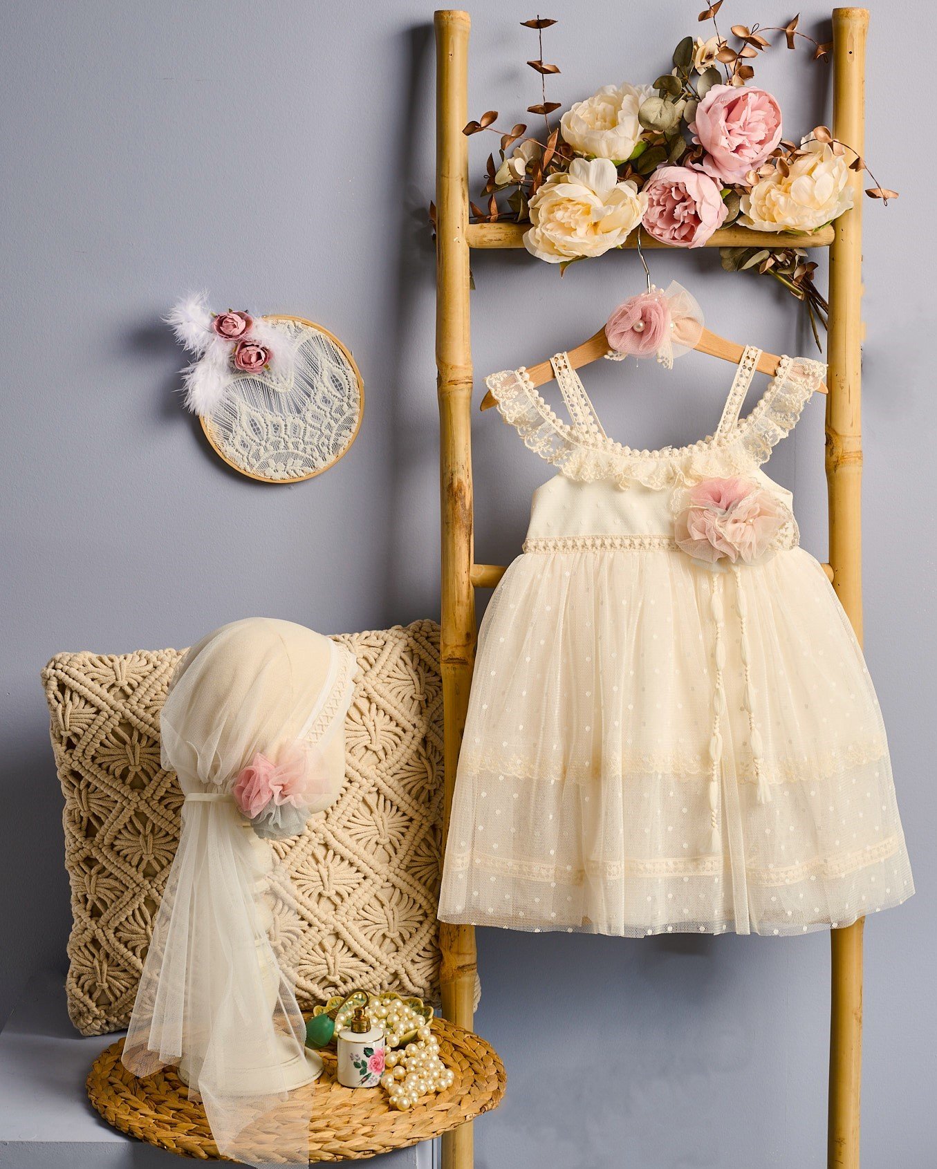 Βαπτιστικό Φόρεμα με πουά τούλι σε ιβουάρ απόχρωση συνδυάζεται με μπαντάνα ή ασορτί καρδέλα.