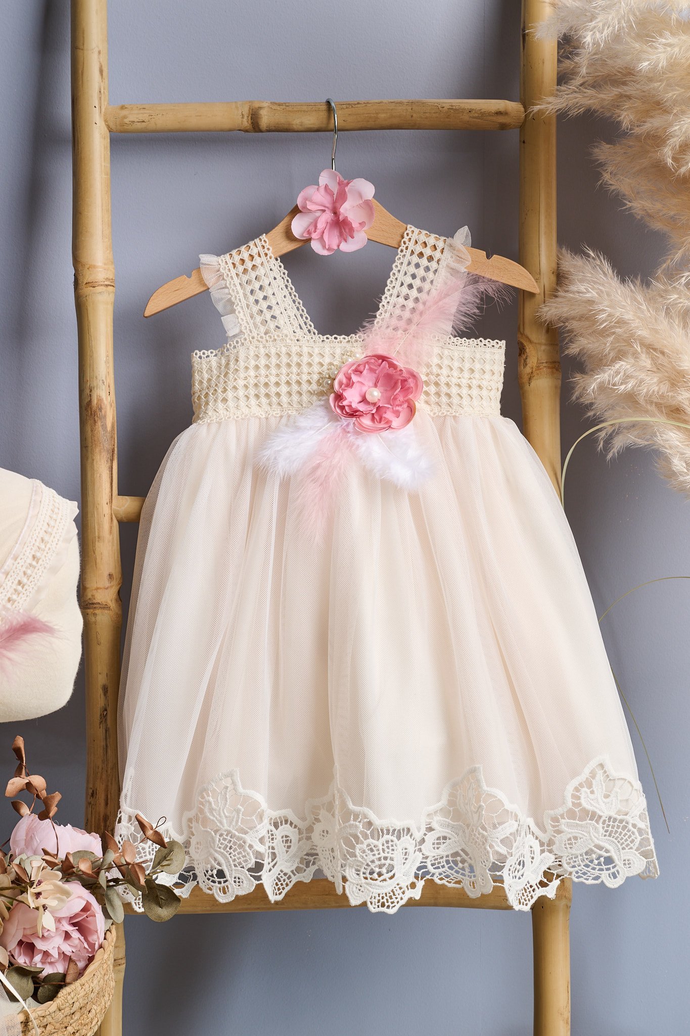 Βαπτιστικό Αέρινο Φόρεμα απο κεντητό τούλι σε απόχρωση βανίλιας. Συνδυάζεται με μπαντάνα ή ασορτί καρδέλα.