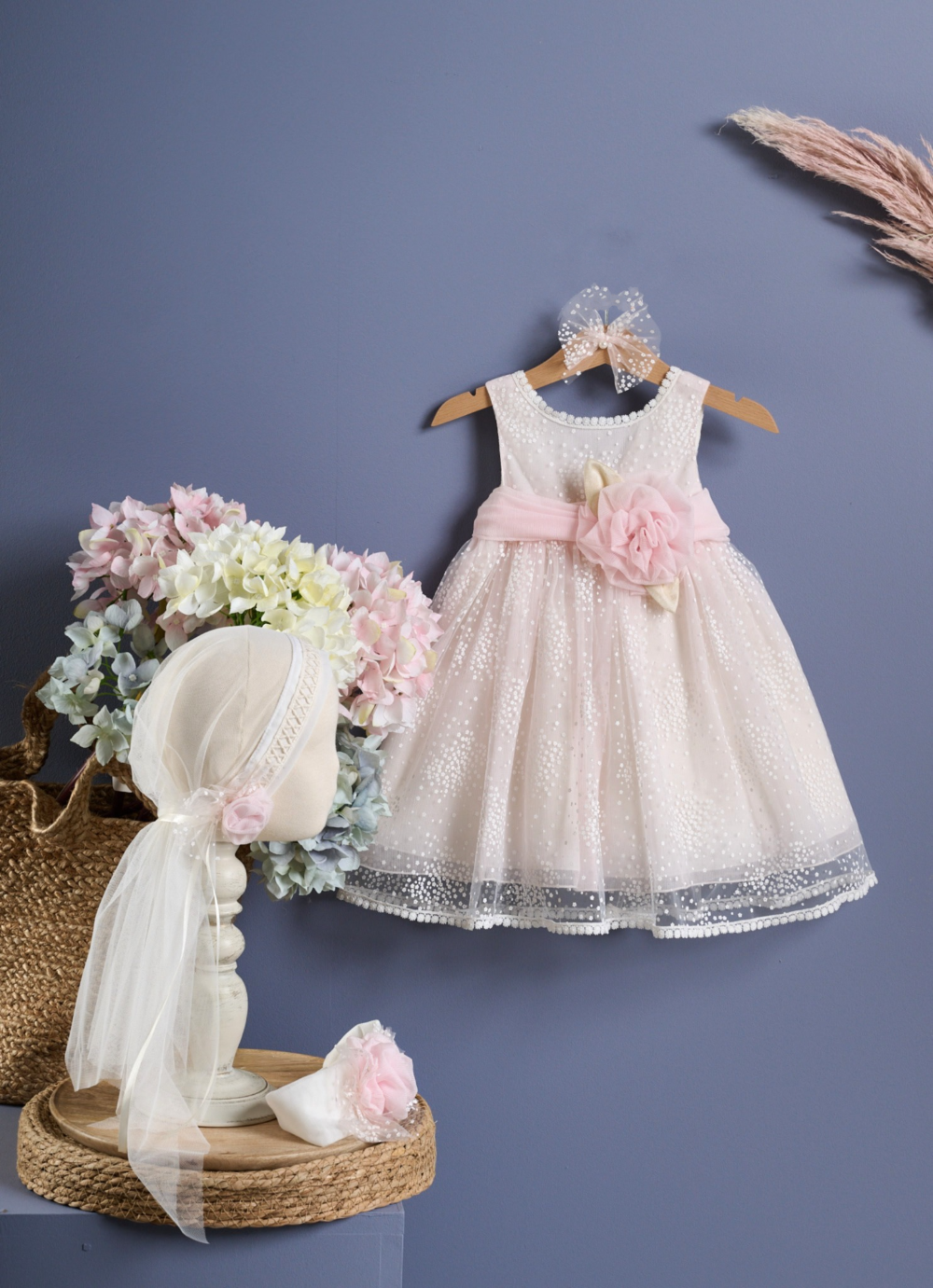 Φόρεμα σε απαλή ρόζ απόχρωση με μπαντάνα ή ασορτί κορδέλα.