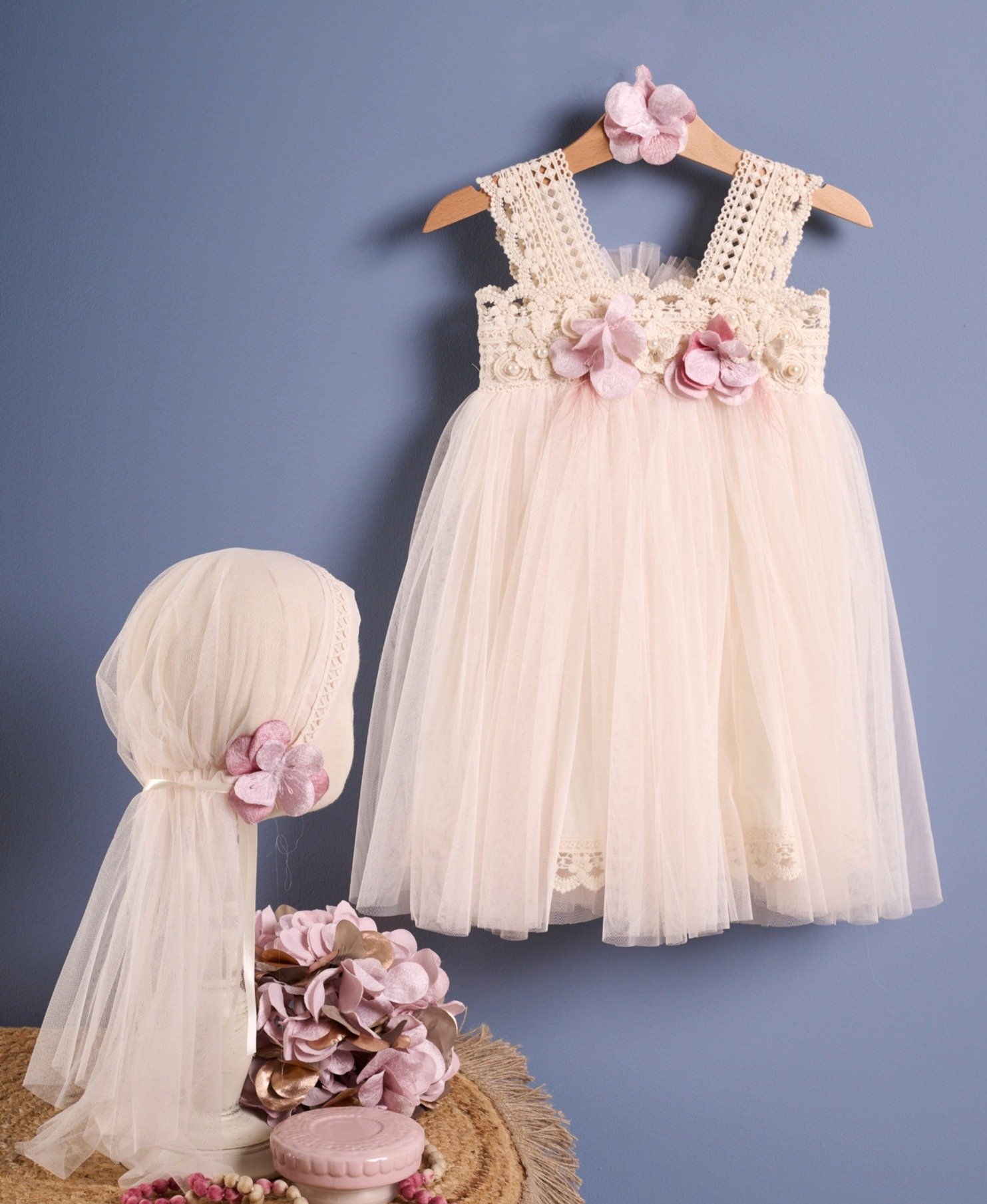 Αμάνικο φόρεμα με κυπούρ στο μπούστο και μπιτουνιέρα σε απαλές αποχρώσεις.