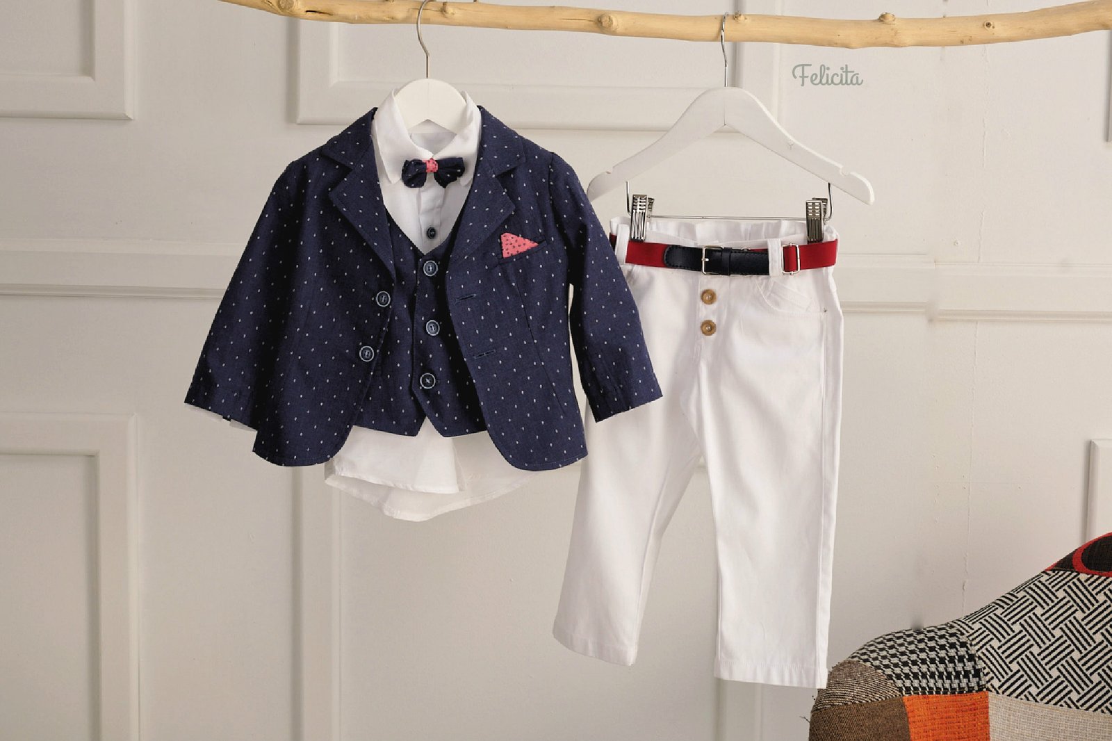 Ντύσιμο καλοκαιρινό και κλασικό με σακάκι και γιλέκο. Το σακάκι και το γιλέκο είναι σε απόχρωση σκούρου μπλε με ένα διακριτικό λευκό πουά μοτίβο. Από το ίδιο ύφασμα είναι φτιαγμένο και το παπιγιόν με λεπτομέρεια από κόκκινο-λευκό πουά ύφασμα. Το σύνολο ολοκληρώνει το κόκκινο-λευκό πουά μαντηλάκι ενώ το πουκάμισο είναι λευκό βαμβακερό. Το παντελόνι λευκό συνδυάζεται με κόκκινη ζώνη και μπλε λεπτομέρεια. Το σύνολο ολοκληρώνεται με ολόλευκο ψάθινο καπέλο με μπλε διακοσμητική λεπτομέρεια.
