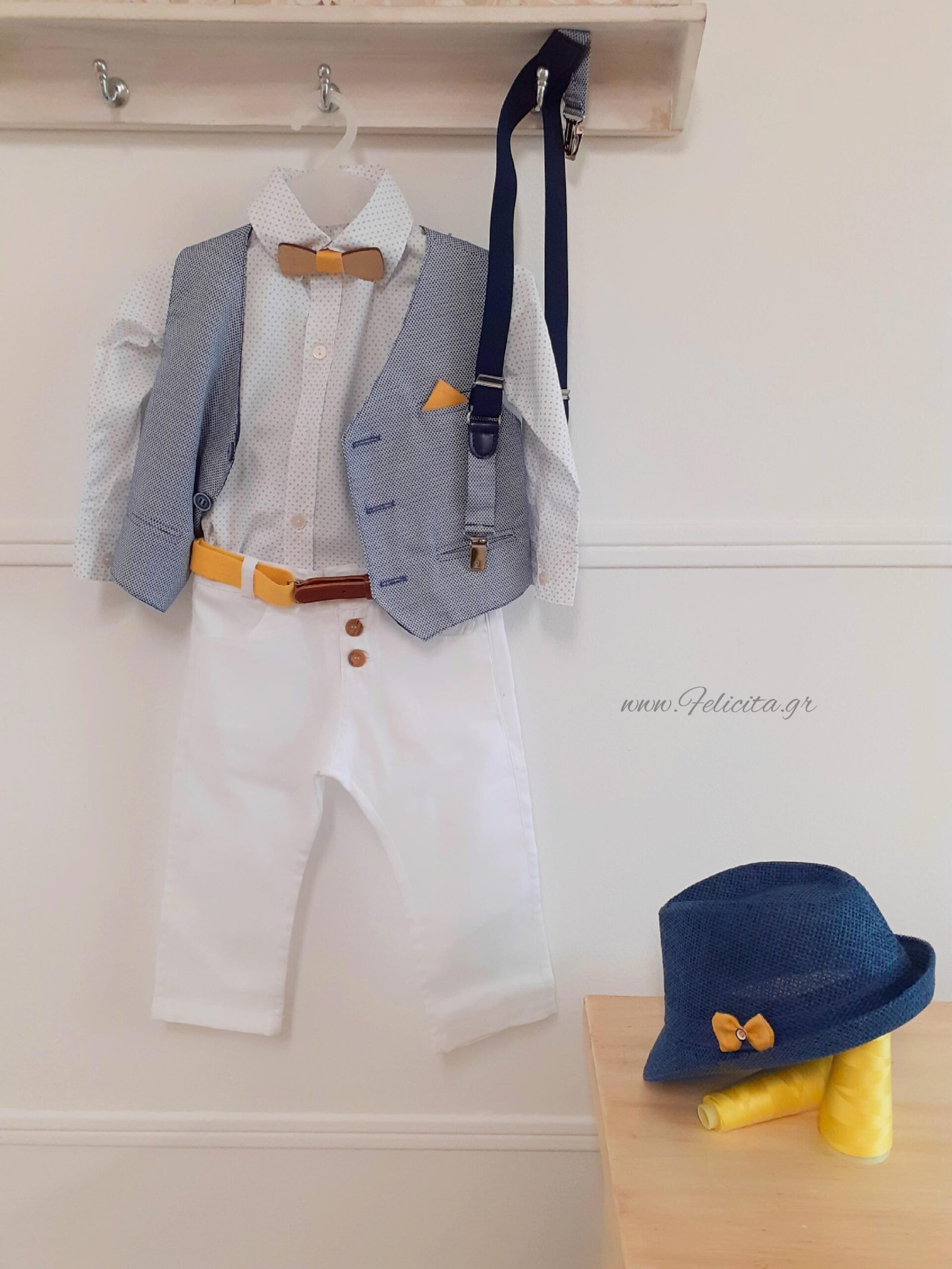 Ανοιξιάτικο και καλοκαιρινό ντύσιμο με λευκό παντελόνι και πουκάμισο λευκό με διακριτικό πουά σχέδιο. Το σύνολο ολοκληρώνεται με μπλε ανοιχτό γιλέκο ενώ οι κίτρινες λεπτομέρειες στο ξύλινο παπιγιόν, το μαντηλάκι και την ζώνη δίνουν χρώμα στο ντύσιμο.