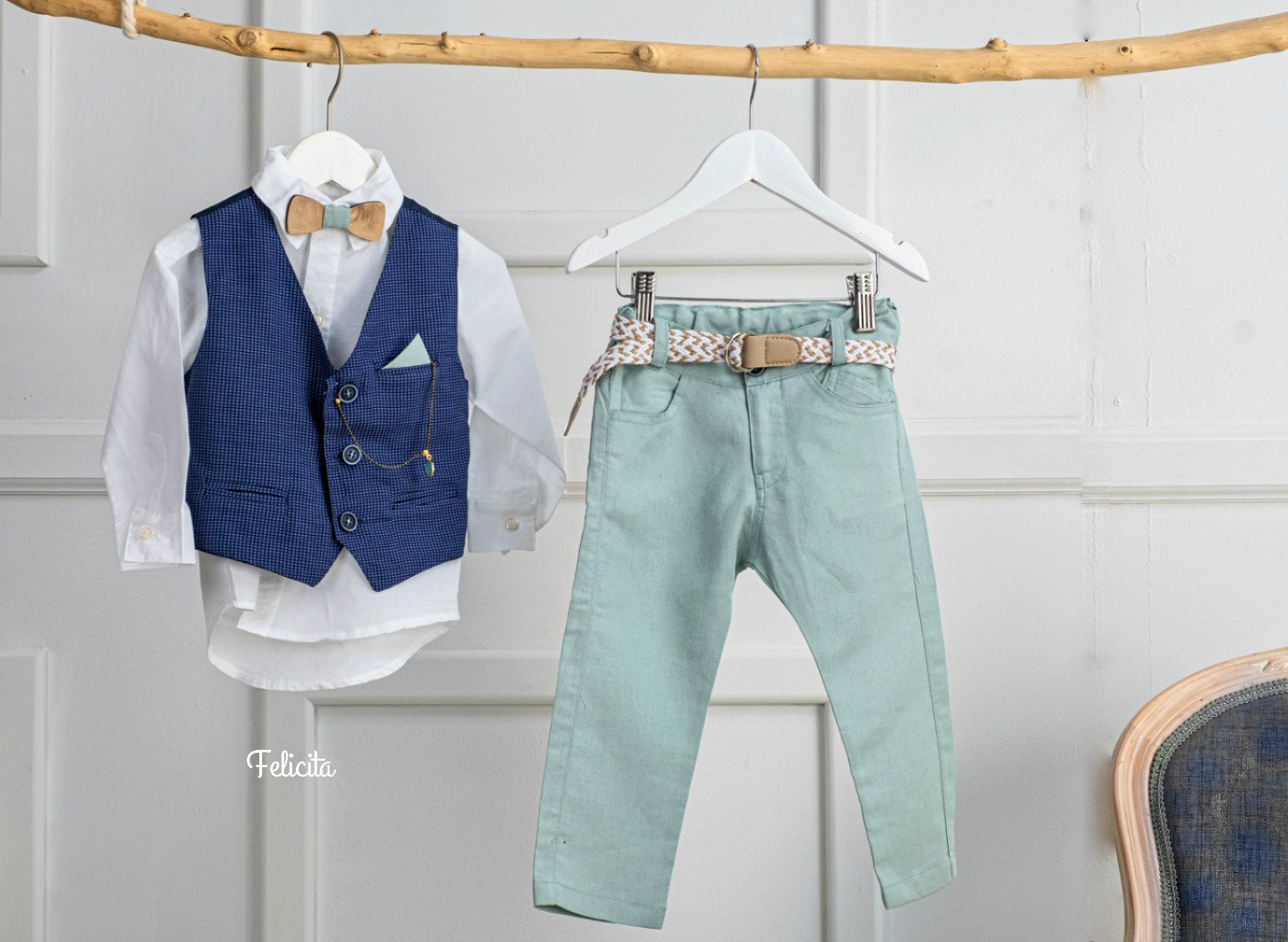 Πρωτότυπο ντύσιμο για αγόρι με βαμβακερό πουκάμισο και μπλε γιλέκο. Το σύνολο ολοκληρώνεται με βεραμάν παντελόνι και ζώνη σε μπεζ και λευκό χρώμα. Συνδυάζεται με μαντηλάκι βεραμάν, ξύλινο παπιγιόν και διακοσμητικό βεραμάν ρολογάκι με χρυσή αλυσίδα.