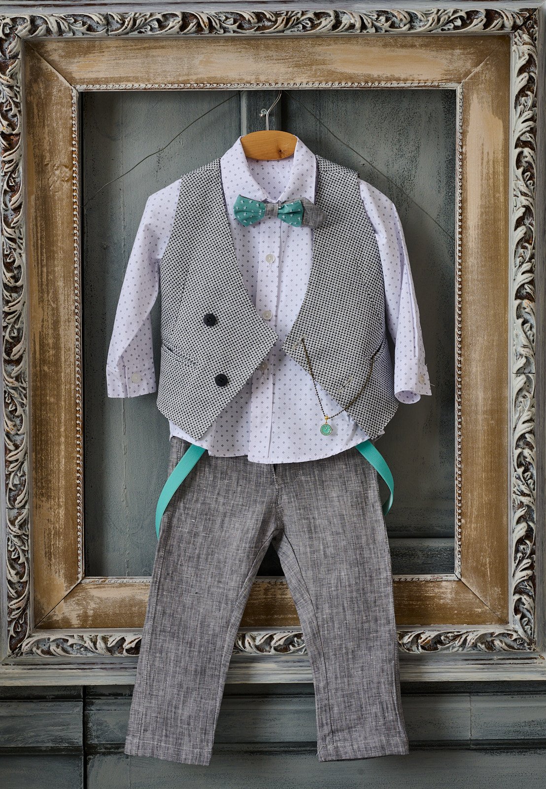 Το σετ αποτελείται από 6 τεμ. (παντελόνι, πουκάμισο, γιλέκο, καπέλο, παπιγιόν, τιράντες)