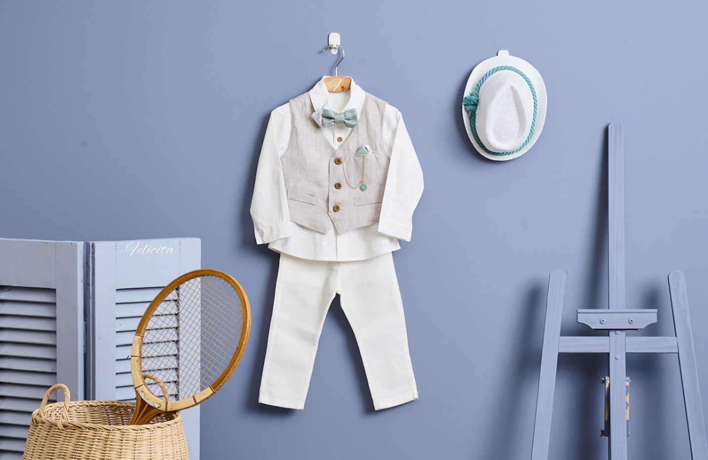 Chic, διακριτικό ντύσιμο με ιβουάρ παντελόνι και μπεζ-γκρι γιλέκο. Το πουκάμισο είναι εκρού με ένα διακριτικό μοτίβο από φυλλαράκια ενώ συνδυάζεται με βεραμάν παπιγιόν. Το ίδιο χρώμα έχει και το μαντηλάκι του γιλέκου ενώ το σύνολο ολοκληρώνεται με διακοσμητική αλυσίδα ρολογιού τσέπης.