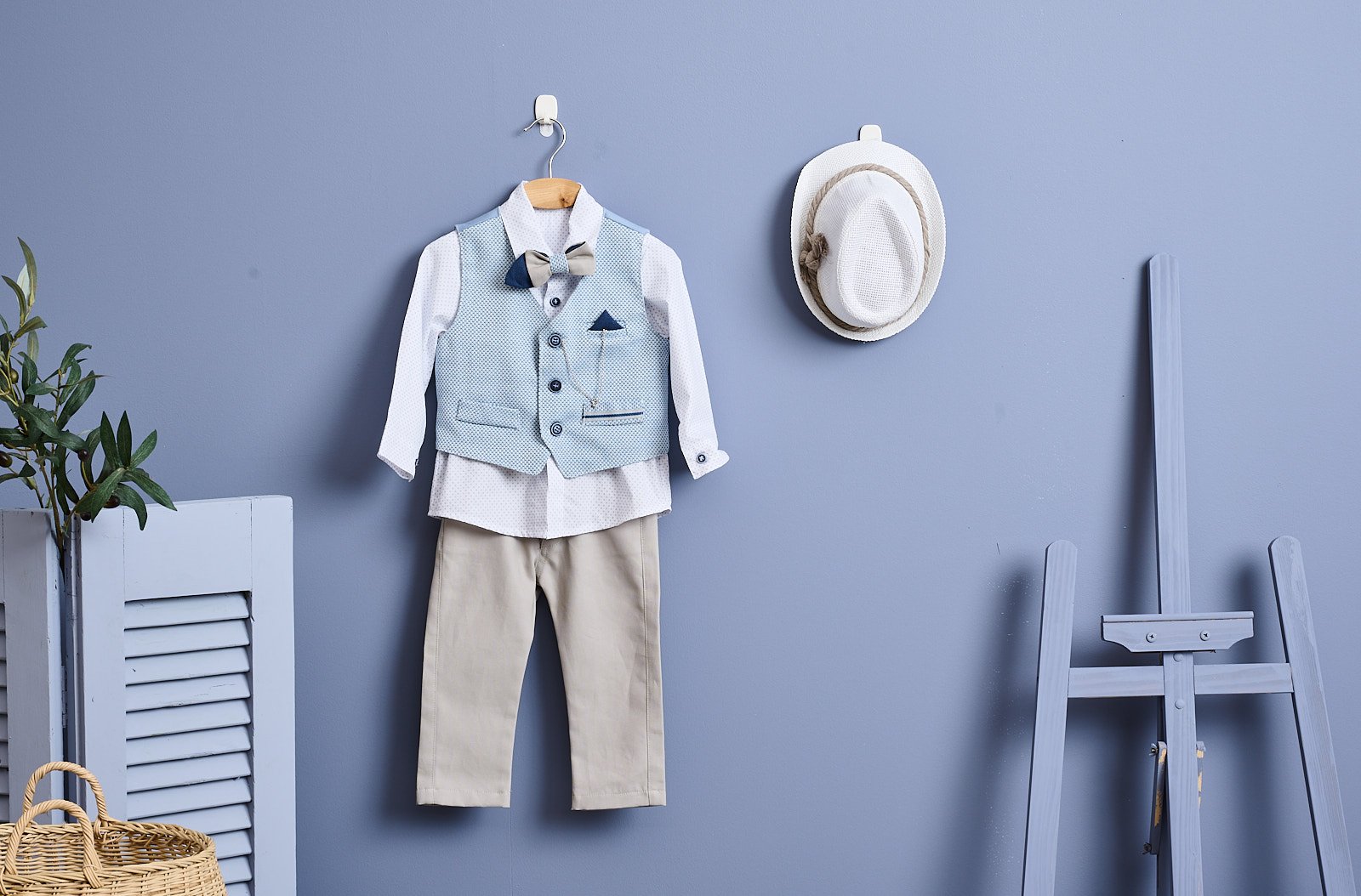 Chic ντύσιμο με μπεζ παντελόνι και πουκάμισο λευκό με διακριτικό πουά. Το σύνολο ολοκληρώνεται με σιελ γιλέκο, μπλε μαντηλάκι και διακοσμητική ασημί αλυσίδα. Το ντύσιμο ολοκληρώνεται με υφασμάτινο διπλό παπιγιόν σε μπεζ και μπλε και λευκό ψάθινο καπέλο με φυσικό σχοινί.