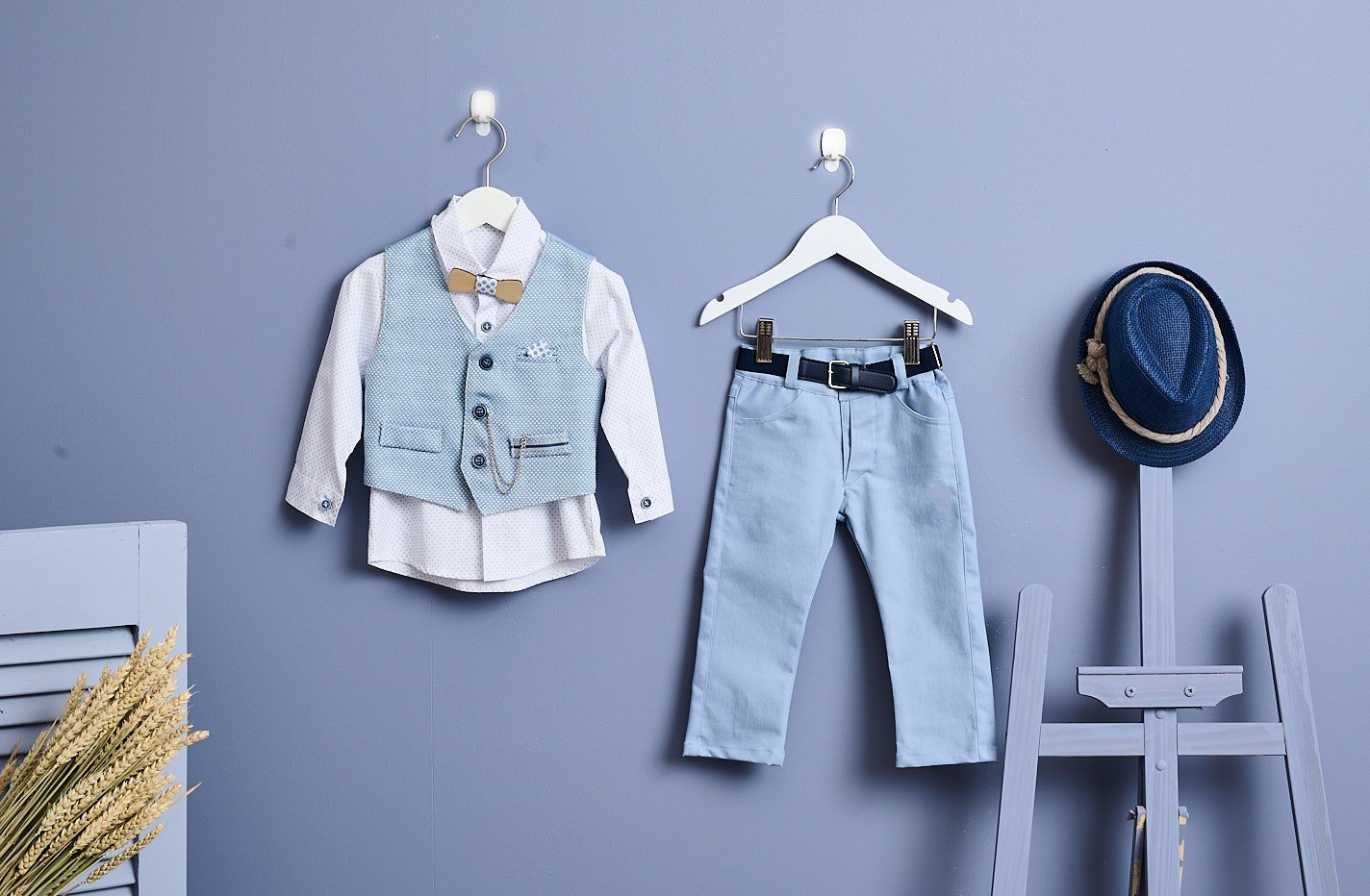 Εξαιρετικό ντύσιμο με σιελ παντελόνι και πουκάμισο λευκό. Το σύνολο ολοκληρώνεται με σιελ γιλέκο και μπλε κουμπιά, πουά μαντηλάκι και διακοσμητική ασημί αλυσίδα. Το ντύσιμο ολοκληρώνεται με ξύλινο παπιγιόν με υφασμάτινη λεπτομέρεια, μπλε ζώνη και μπλε ψάθινο καπέλο με φυσικό σχοινί.