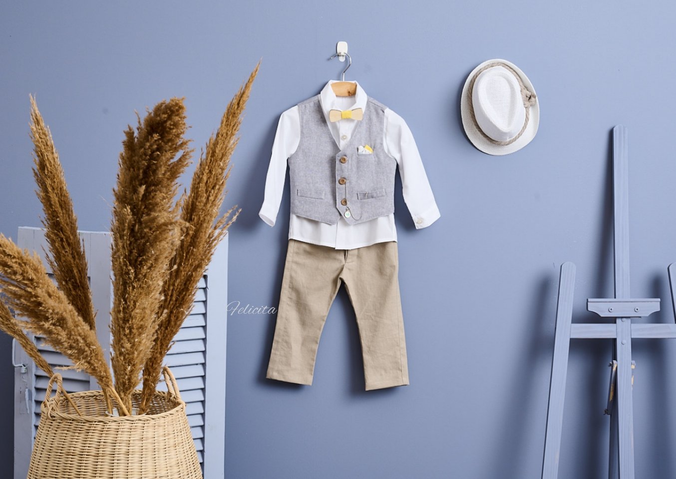 FA72.882390 Ντύσιμο με γιλέκο σιέλ μπλε και παντελόνι μπεζ (με κίτρινο ή μέντα)