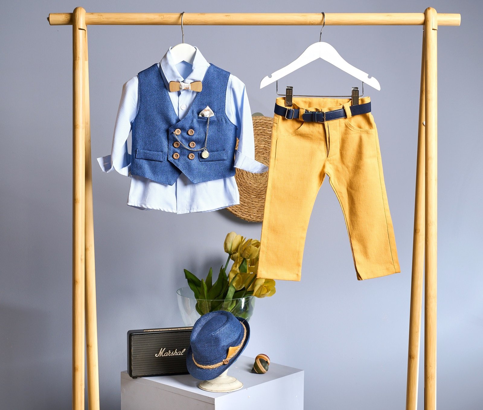 Διακριτικό ντύσιμο με σκούρο κίτρινο παντελόνι και πουκάμισο σιέλ με πολυ διακριτικό σχέδιο . Το γιλέκο,μπλέ με ιδιαίτερη πλέξη , στολίζεται με διακριτικό μεταλλικό ρολόι , ξύλινα κουμπιά ,μαντιλάκι ασσορτί με το ξύλινο παπιόν ,ενώ το σύνολο ολοκληρώνεται με μπλέ ζώνη ,καπέλο μπλέ στολισμένο και ξυλινο παπιγιόν.