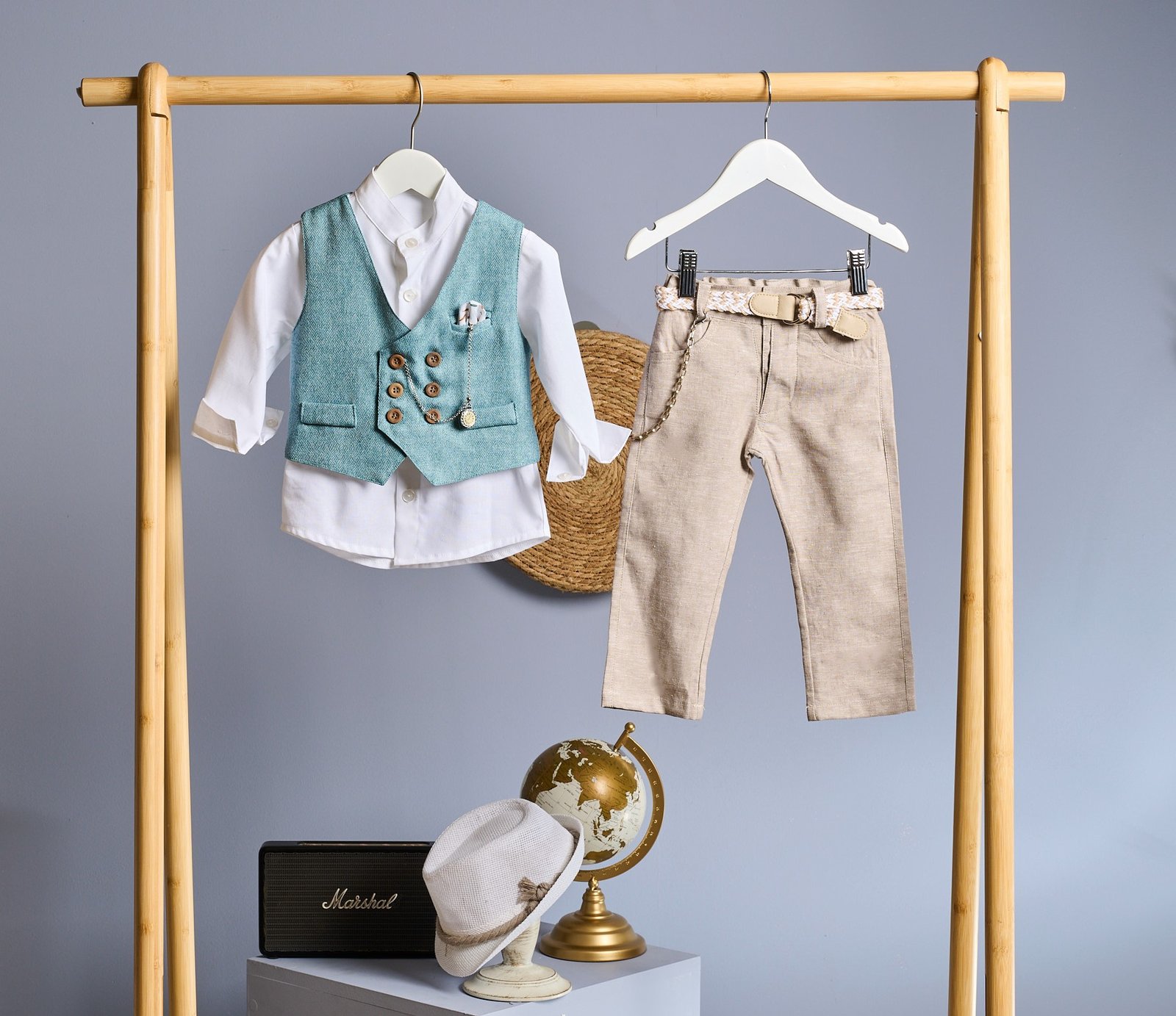FA77.852419 Ντύσιμο με γιλέκο πετρόλ & καφέ ανοιχτό παντελόνι