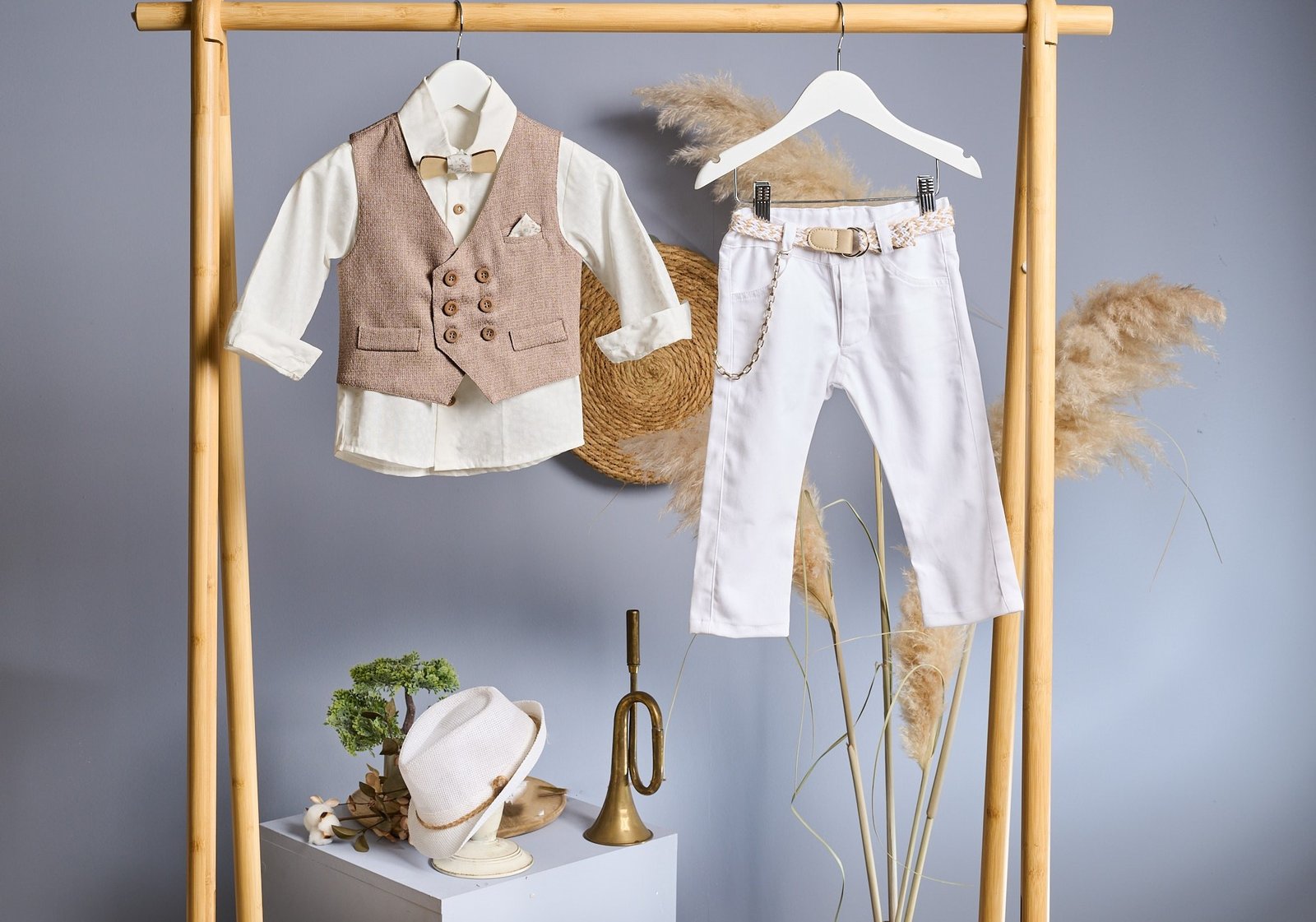 Διαχρονικό ντύσιμο με λευκή καπαρτίνα παντελόνι και πουκάμισο εκρού με σχεδιο . Το γιλέκο καφέ σε ιδιαίτερη πλέξη , στολίζεται με ξύλινα κουμπιά και μαντιλάκι .Ενώ το σύνολο ολοκληρώνεται με πλεκτή ζωνη στην ιδια απόχρωση ,καπέλο λευκό στολισμένο ,ξύλινο παπιόν και αλυσίδα διακοσμητική .