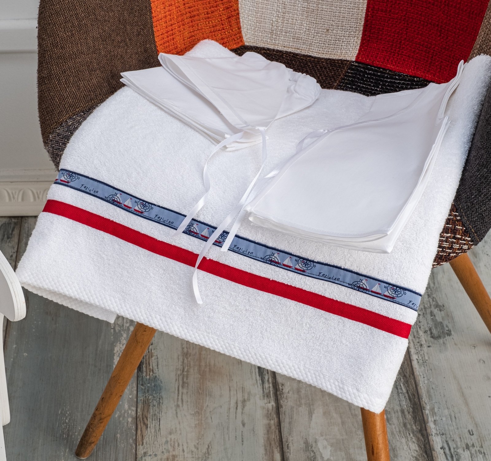 Κλασικά λαδόπανα λευκά με κόκκινη λεπτή κορδέλα και κορδέλα μπλε με καραβάκια.