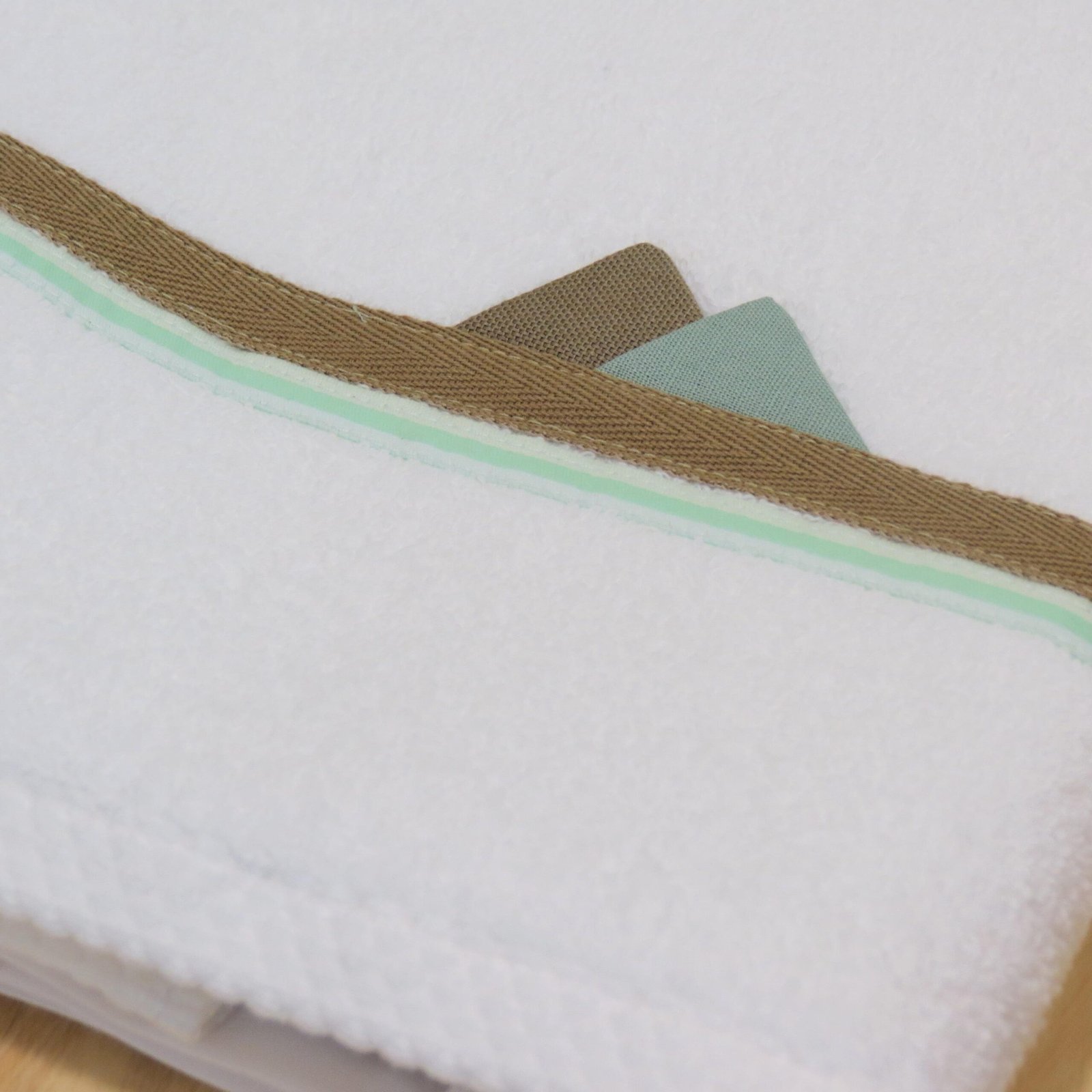 Λευκά λαδόπανα για αγόρι με διακριτική τρέσα σε βεραμάν και γιούτα. Μικρά τριγωνάκια υφασμάτινα σε αποχρώσεις του βεραμάν και ταμπά ολοκληρώνουν το σύνολο.