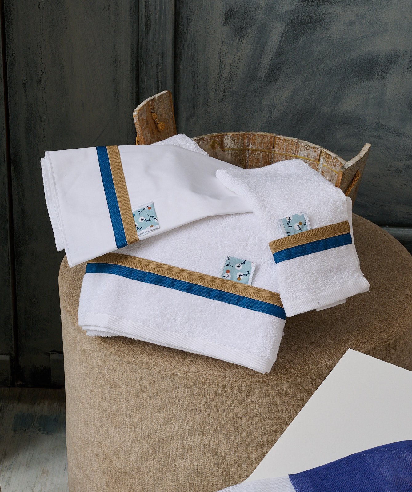 Λαδόπανα σετ λευκά με λεπτές κορδέλες μπλε και γλυκό καφέ ραμμένες κατά μήκος και με μια μικρή λεπτομέρεια- ετικέτα από ύφασμα με σχέδιο γαλάζιο με διακριτικά φύλλα. Είτε επιλέξετε το πακέτο με θέμα το καραβάκι, είτε το ξύλινο αλογάκι, είτε το πακέτο με τα αστέρια, αυτό το σετ θα ταιριάξει απόλυτα σε κάθε επιλογή.