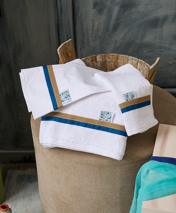 Λαδόπανα σετ λευκά με λεπτές κορδέλες μπλε και γλυκό καφέ ραμμένες κατά μήκος και με μια μικρή λεπτομέρεια- ετικέτα από ύφασμα με σχέδιο γαλάζιο με διακριτικά φύλλα. Είτε επιλέξετε το πακέτο με θέμα το καραβάκι, είτε το ξύλινο αλογάκι, είτε το πακέτο με τα αστέρια, αυτό το σετ θα ταιριάξει απόλυτα σε κάθε επιλογή.