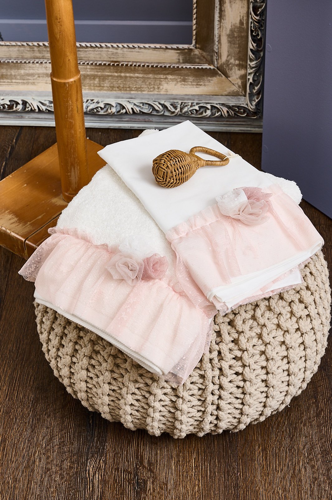 Λαδόπανα για κορίτσι με old pink δανδέλα και διακριτικά τούλινα λουλουδάκια σε αποχρώσεις ιβουάρ , nude και σάπιου μήλου.