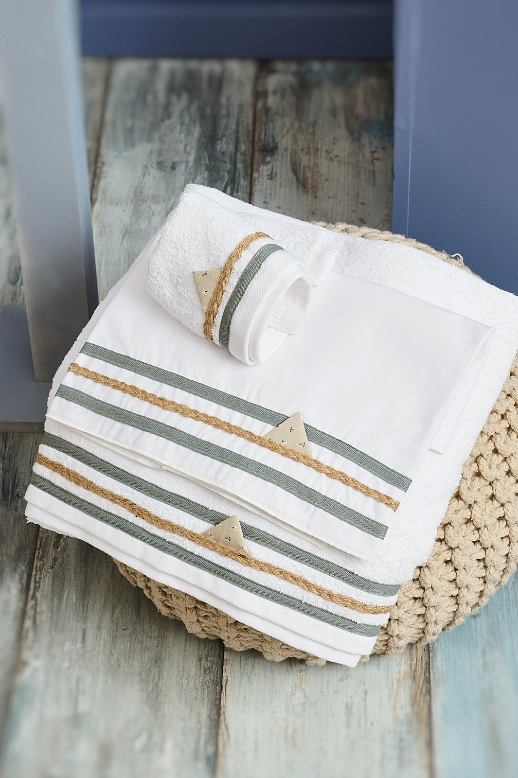 Λαδόπανα βάπτισης για αγόρι με λαδί γκρι κορδέλα και φυσικό σχοινί. Μικρή υφασμάτινη λεπτομέρεια εμπριμέ μπεζ ολοκληρώνει το σύνολο.