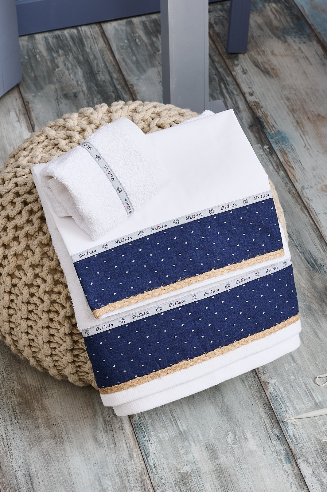 Λαδόπανα βάπτισης για αγόρι με μπλε πουά φάσα και τελείωμα από φυσικό σχοινί-πλεξούδα. Μια διακριτική γκρι τρέσα με το λογότυπο “Felicita” ολοκληρώνει το σχέδιο.