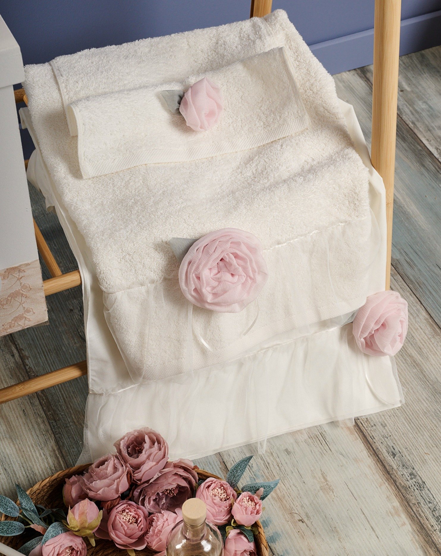 Χαρακτηριστικό ειναι η τούλινη λεπτομέρεια που στολίζει κατά μήκος την μεγάλη πετσέτα ,το σεντόνι και διακριτικά την μικρή πετσέτα με εντυπωσιακό λουλούδι σε αποχρώση ρόζ απαλό.