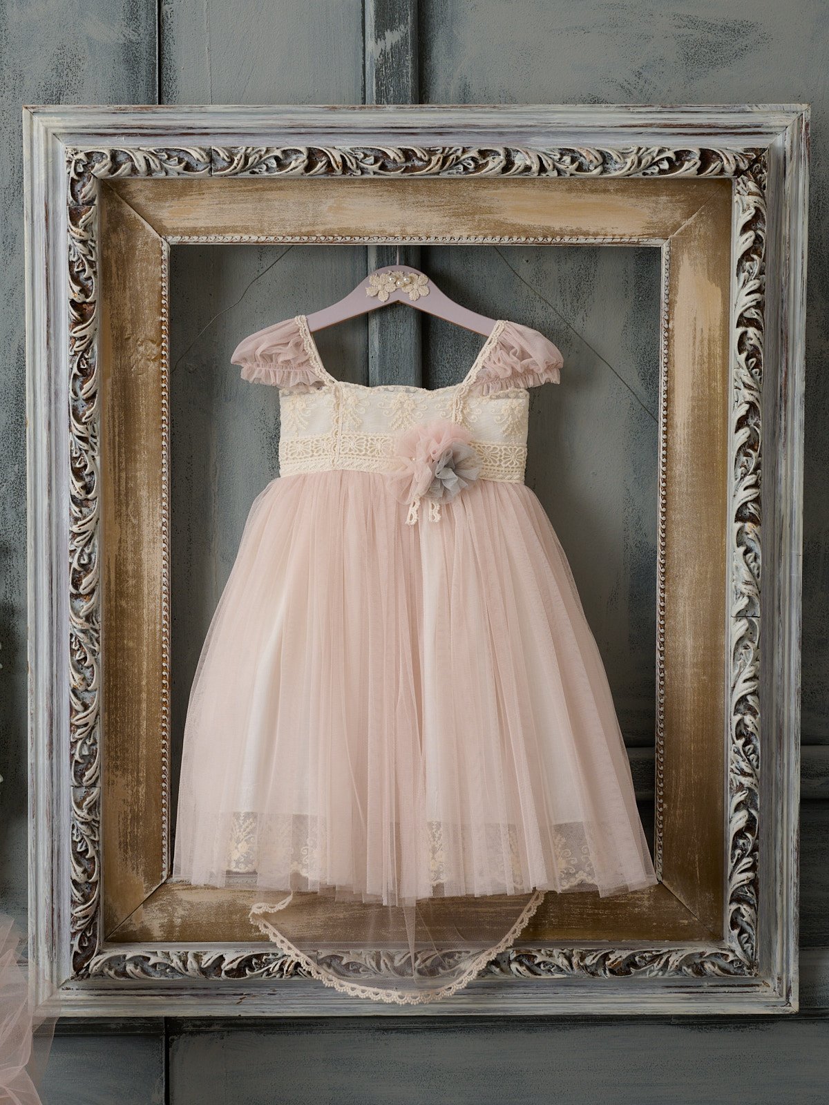 Nude φόρεμα με κομψές δαντελένιες τιράντες.To ιβουάρ δαντελένιο μπούστο καταλήγει σε μια ροζ τούλινη φούστα. Η εσωτερική λευκή φόδρα με το δαντελένιο τελείωμα ολοκληρώνει την κομψότητα της φούστας. Η μέση διακοσμείται από διακριτικά, τούλινα λουλούδια σε ροζ και γκρι αποχρώσεις.
