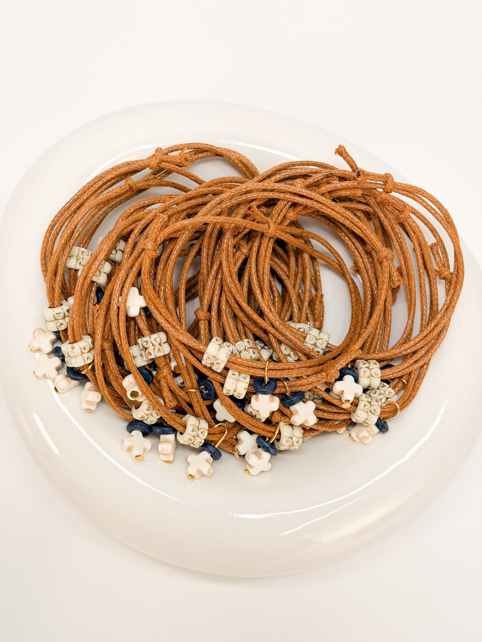 Μαρτυρικό βραχιόλι με κορδόνι σε καφέ απόχρωση,σταυρό χαολίτη,κεραμική μπλε χάντρα και δίχρωμη ακρυλική χάντρα σε χρυσή-λευκή απόχρωση.