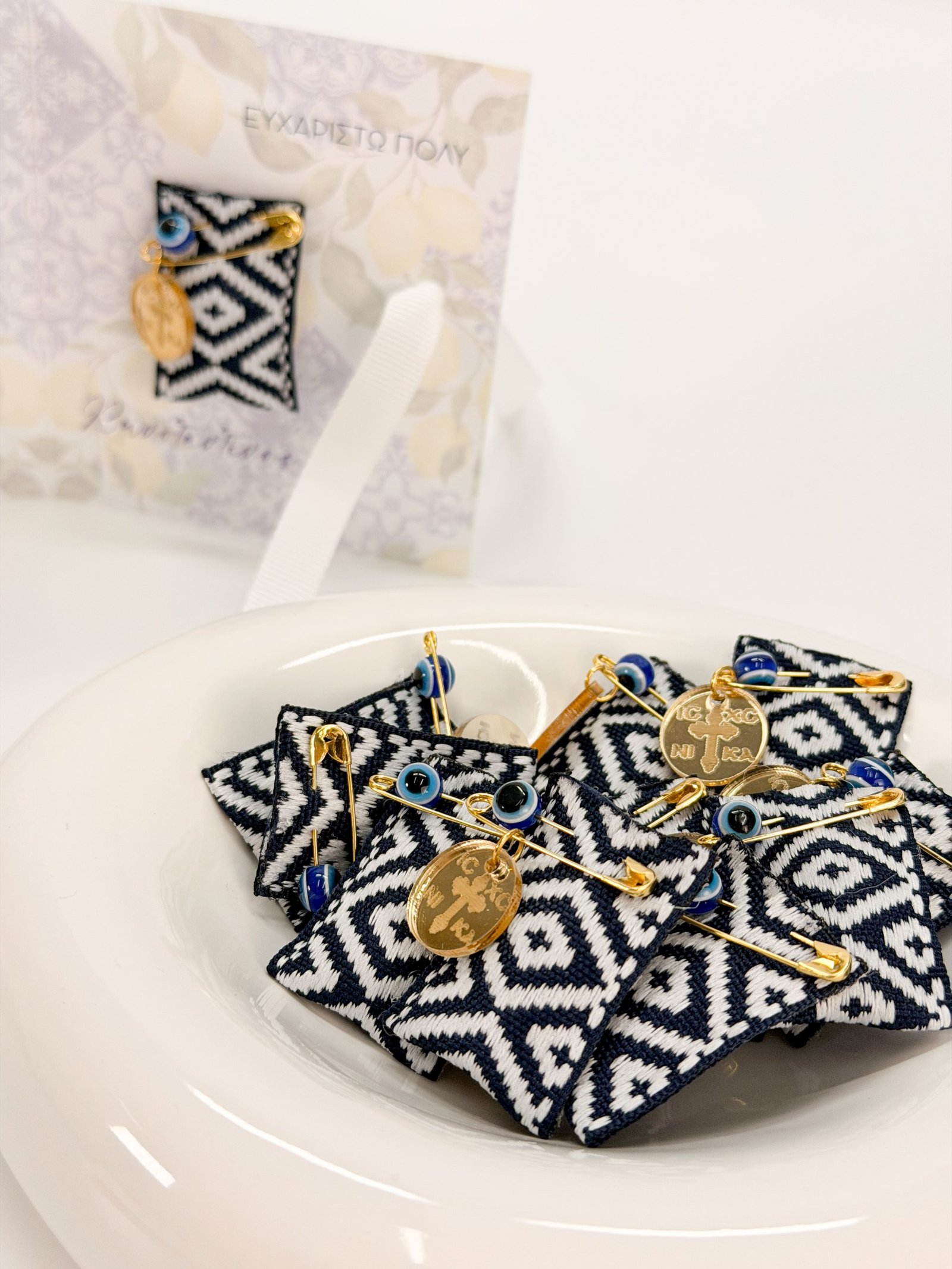 Μαρτυρικό πέτο με δίχρωμη τρέσα σε μπλε-ασπρη απόχρωση,μπλε μάτι και plexiglass σταυρό κωνσταντινάτο.