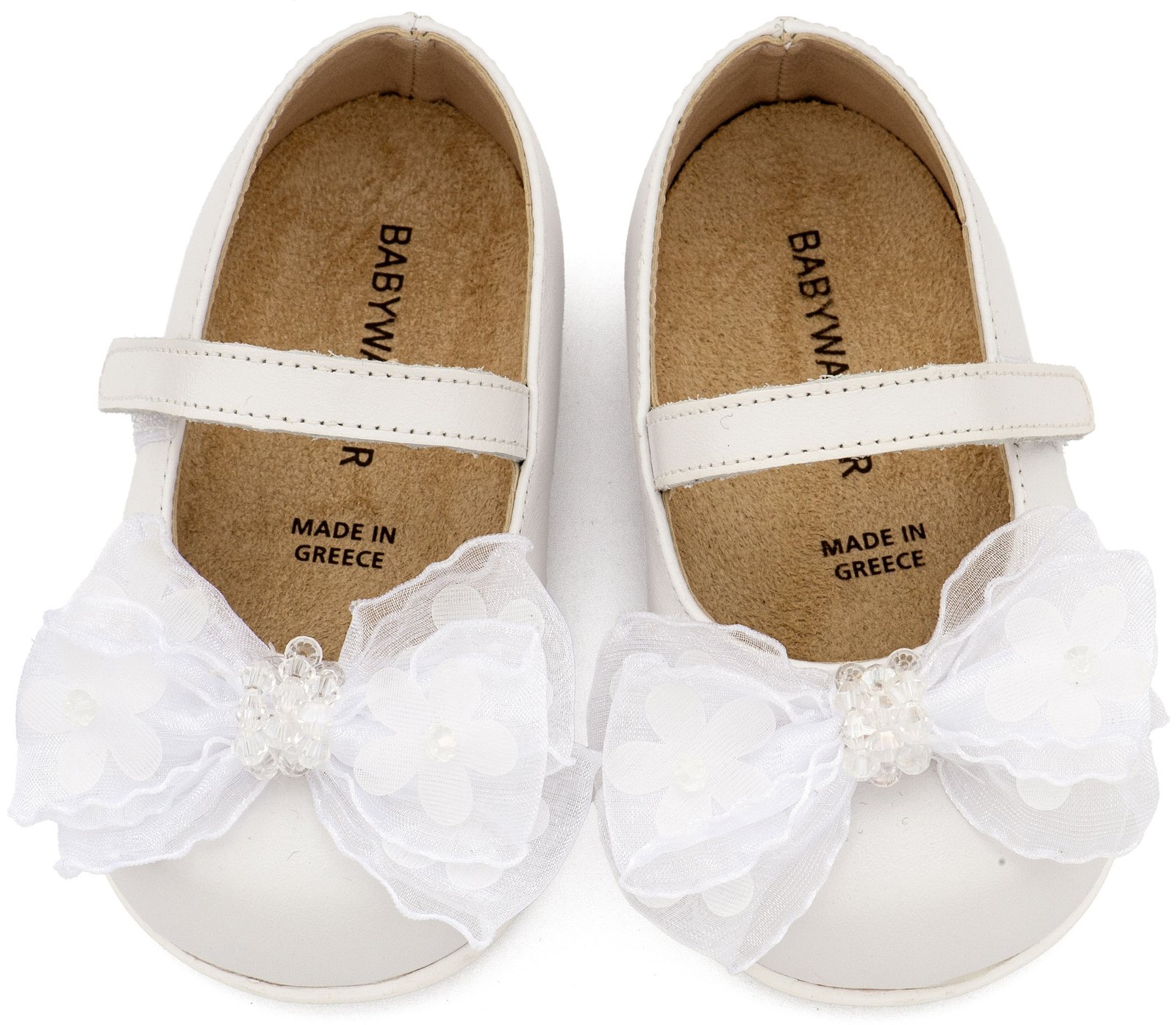 Δερμάτινο Γοβάκι Μονή Μπαρέτα Φιογκάκι Οργάντζας σε Λευκό Χρώμα